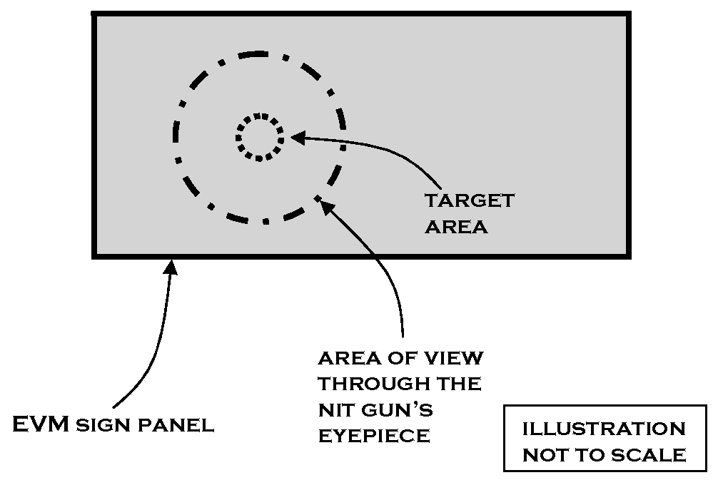 The measurement point shall be located at a distance far enough from the EVM sign that individual LEDs (or other light-emitting source) are not distinguishable but close enough such that only the EVM sign panel is visible in the nit gun's eyepiece (LEDs are grouped in threes: one (1) red, one (1) blue, (1) green. If these are individually distinguishable the measurement point must be located further away).