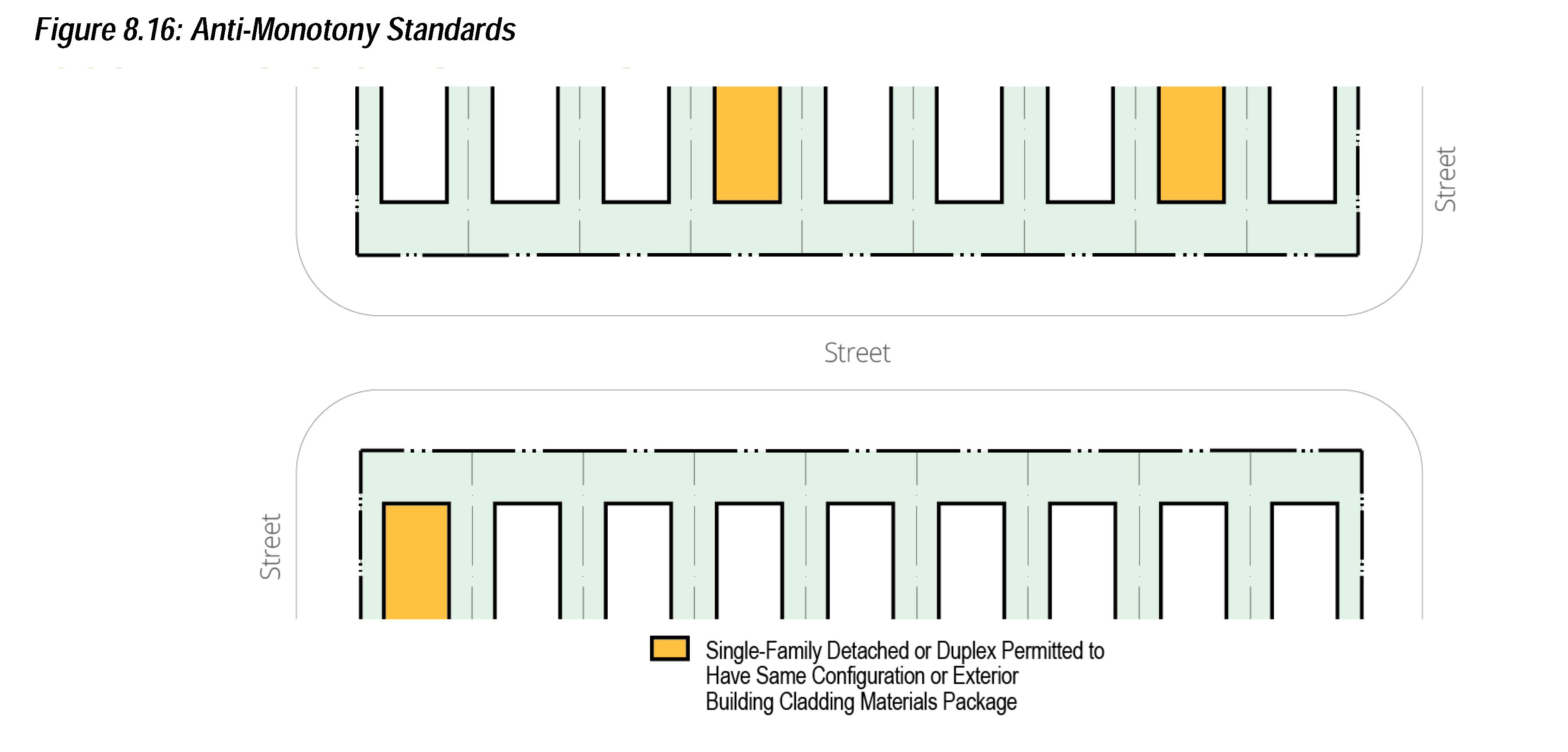 No single-family detached house or duplex in a residential subdivision in the RS1, RS2, RS3, or RD districts shall have the same configuration or exterior building cladding materials package, excluding roof materials, as any other single family detached house or duplex within three houses on either of the subject property or on any of the five single-family detached houses or duplexes directly across the street from the subject property. These standards shall not supersede private covenants.