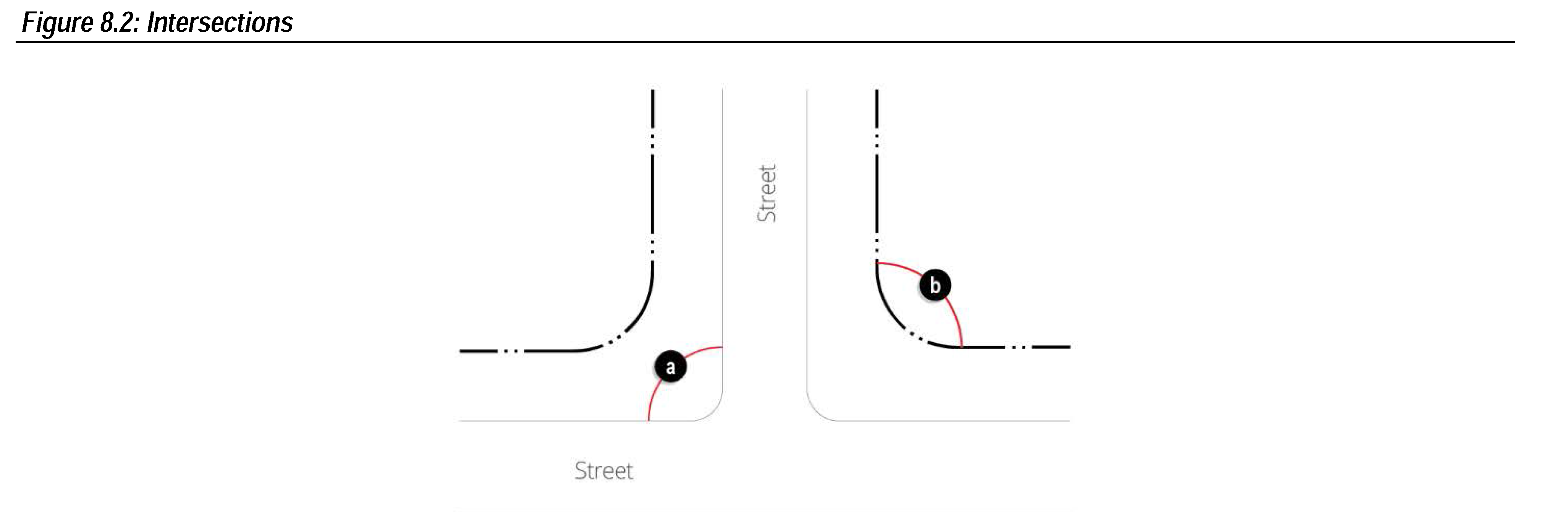 Alignment. Horizontal changes in alignment shall be gradual and at intersection corners shall have a radius of 20 feet to permit safe vehicular turning movements.