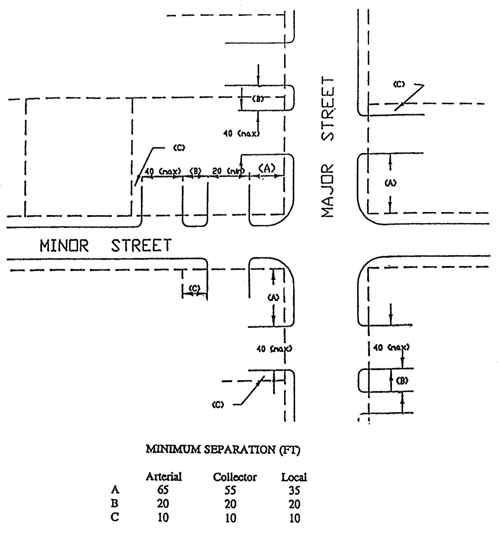 Driveway spacing for high volume driveways. The developer shall design and construct high volume driveways according to the spacing standards shown in figure 14-16.