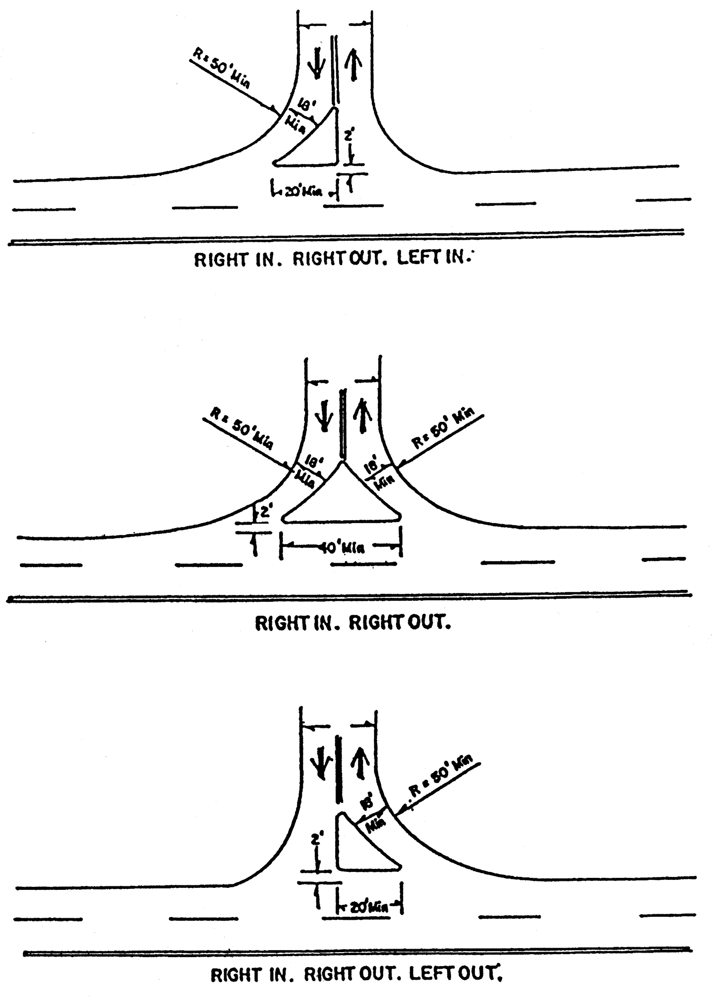 In some cases, where necessary for the safe and efficient movement of traffic, the city may require that special design techniques be employed to restrict or limit turning movements into or out of a driveway before the driveway can be approved. Such restrictions do not affect the number and location of access points as specified elsewhere. Figure 14-17 gives approved minimum design criteria for limited movement driveways. Deceleration lanes may also be required to be incorporated into the design.