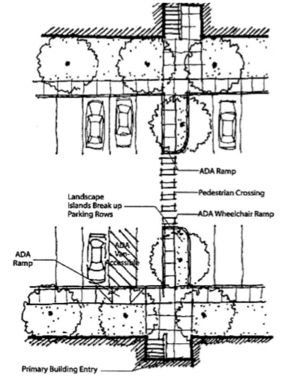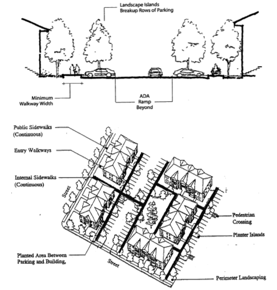The purpose of this Chapter is to provide basic and flexible standards for development of vehicle and bicycle parking. The design of parking areas is critically important to the economic viability of some commercial areas, pedestrian and driver safety, the efficient and safe operation of adjoining streets, and community image and livability. Historically, some communities have required more parking than is necessary for some land uses, paving extensive areas of land that could be put to better use. Because vehicle parking facilities occupy large amounts of land, they must be planned and designed carefully to use the land efficiently, minimize stormwater runoff, and maintain the visual character of the community. This Chapter recognizes that each development has unique parking needs and provides a flexible approach for determining parking space requirements (i.e., “minimum” and “performance-based” standards). This Chapter also provides standards for bicycle parking because many people use bicycles for recreation, commuting, and general transportation. Children as well as adults need safe and adequate spaces to park their bicycles throughout the community.