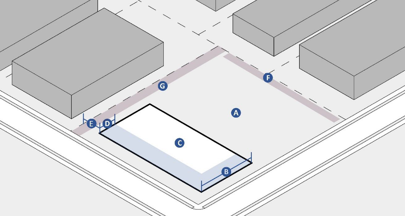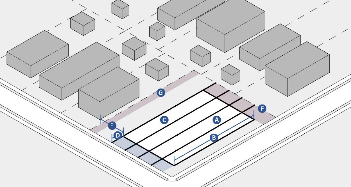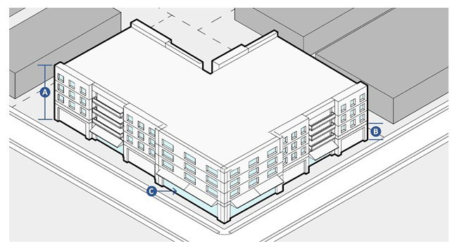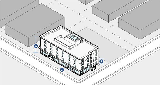 An angled pedestrian entrance may be provided at either corner of a building along the street to meet the street-facing pedestrian entrance requirements.