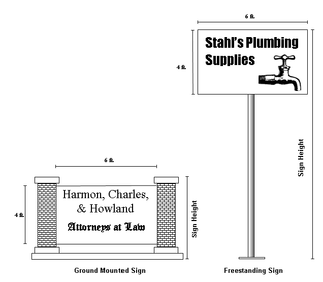 Setback: The following signs shall be erected no closer than seven and one-half feet to any property line or public street right-of-way. In addition, such signs shall comply with Section 4.11 of the Zoning Code, which deals with vision clearance at street intersections. If the adjoining street right-of-way is less than 50 feet in width, each such sign shall be located no closer than 35 feet from the centerline of the right-of-way.
