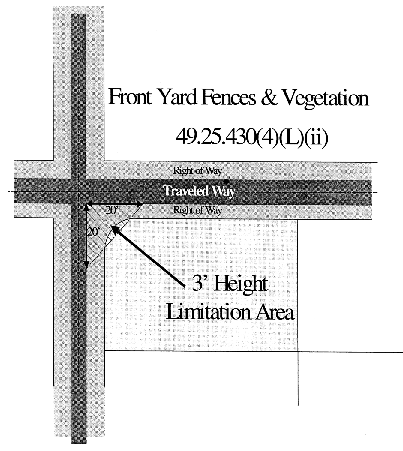 On corner lots the maximum height of a sight-obscuring fence or vegetation located within 20 feet of a street intersection shall not exceed three feet. The area in which sight-obscuring fences and vegetation is restricted shall be determined by extending the edge of the traveled ways to a point of intersection, then measuring back 20 feet, then connecting the points. In this area, vegetation shall be maintained to a maximum height of three feet. Trees are allowed in this area provided the trees do not obscure view from a height of three to eight feet above the ground.