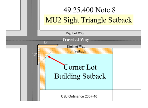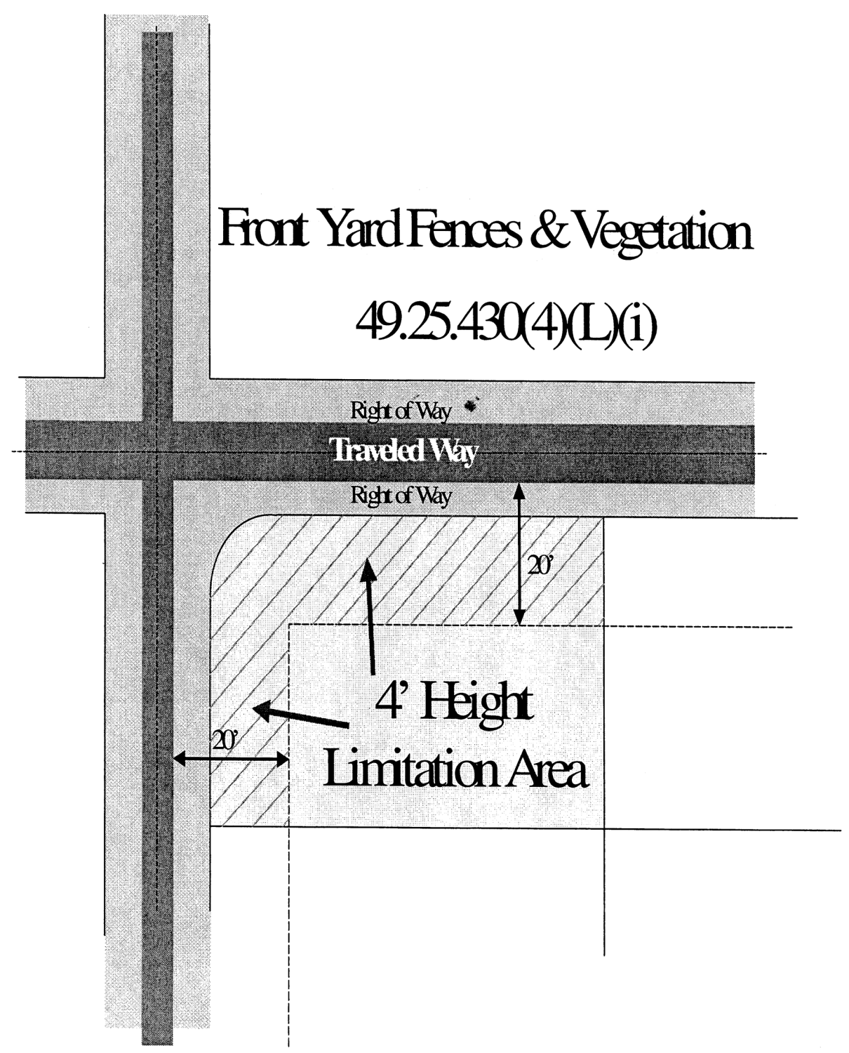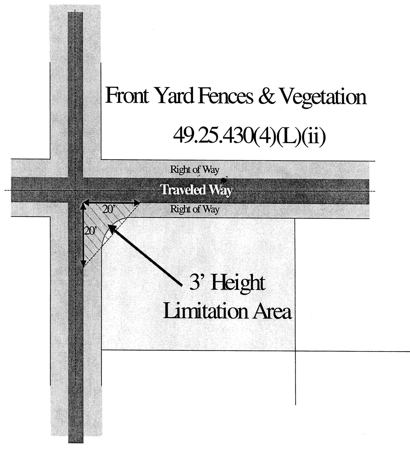 On corner lots the maximum height of a sight-obscuring fence or vegetation located within 20 feet of a street intersection shall not exceed three feet. The area in which sight-obscuring fences and vegetation is restricted shall be determined by extending the edge of the traveled ways to a point of intersection, then measuring back 20 feet, then connecting the points. In this area, vegetation shall be maintained to a maximum height of three feet. Trees are allowed in this area provided the trees do not obscure view from a height of three to eight feet above the ground.