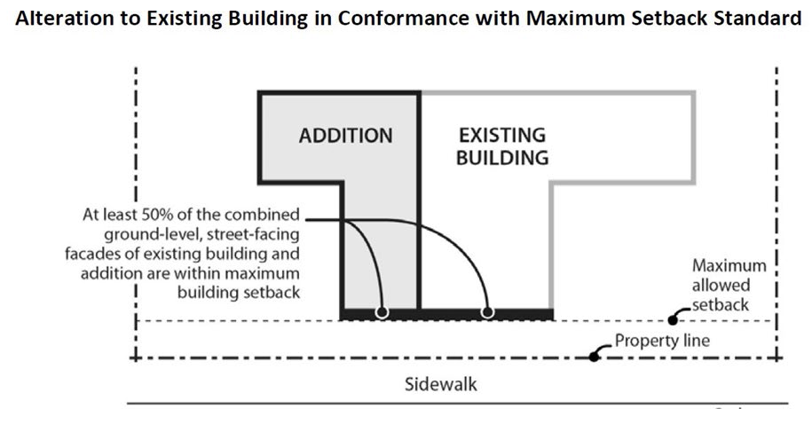 Maximum building setback for NC and MU3. At least 50 percent of the length of the ground level, street-facing façade of a new or altered building shall be within the maximum setback for the underlying zoning district. Where there is more than one building on a lot, the maximum standard applies to the combined ground level, street-facing façades of all the buildings.