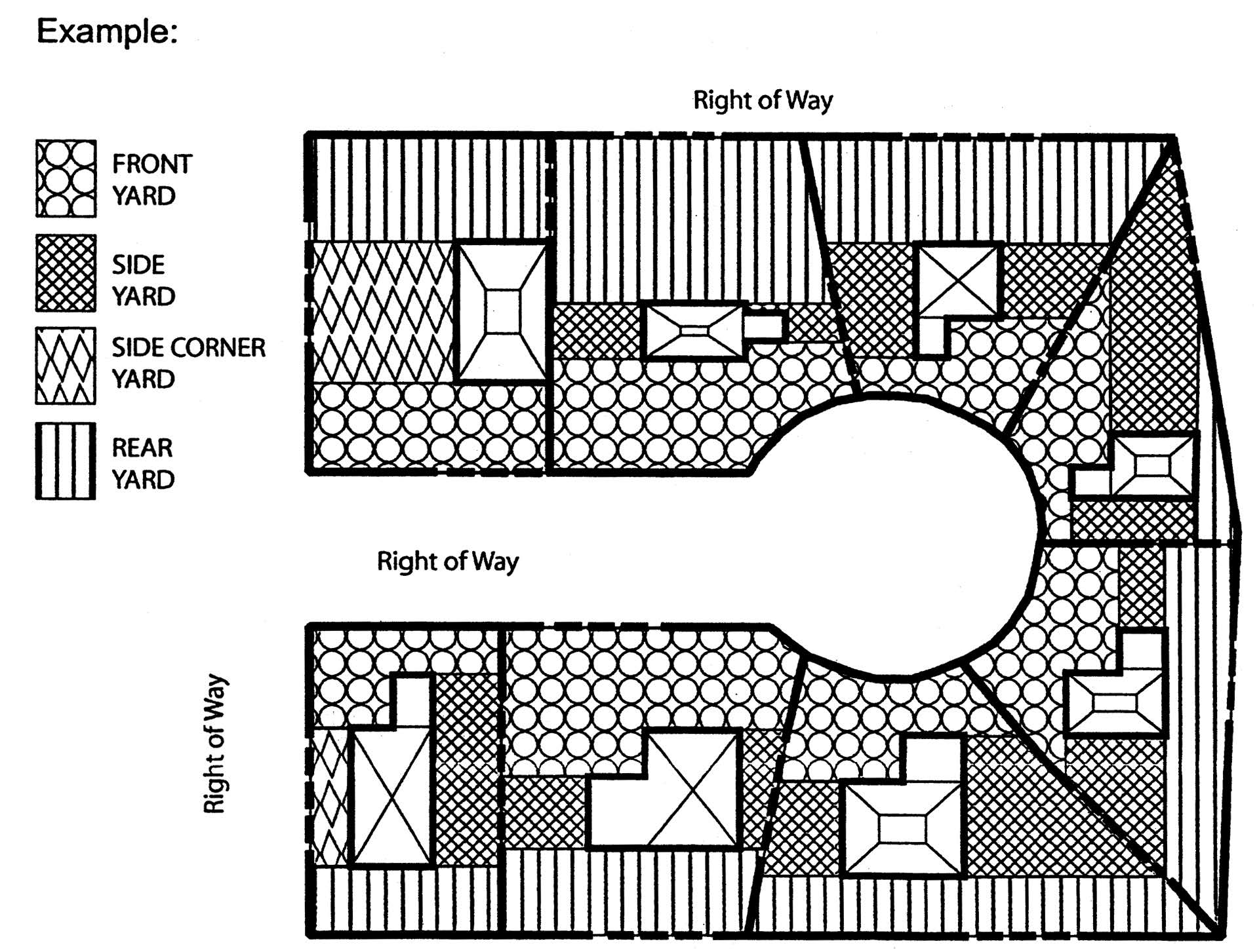 Yard, front, means the area between the front lot line and the building facade, formed by drawing a straight line from the front corners of the building to the side lot lines or rights-of-way. (See example below.)