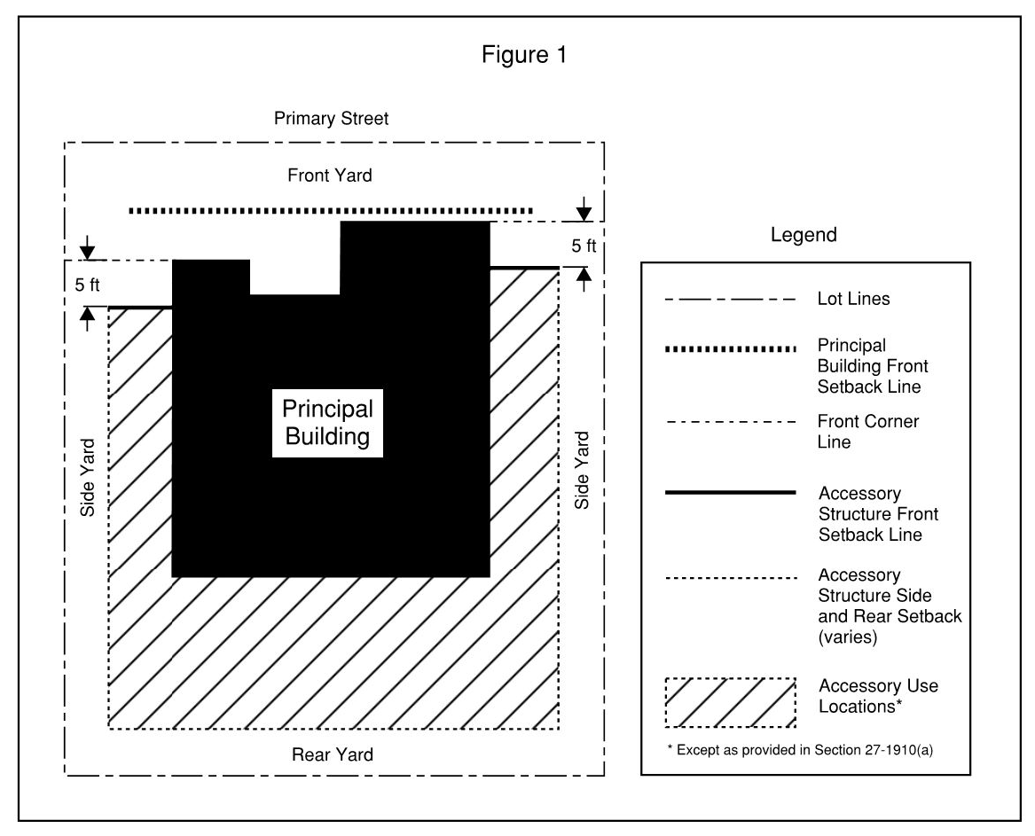 Residential districts. All accessory uses, buildings and structures shall be located on the same lot as the principal or main use and not within any required yard setback except as established in section 27-1910 and subsection 27-2307(g). Structures that are pedestrian amenities and are located in the front or side corner yard, visible and/or usable along the right-of-way, are not structures which are required to meet setbacks residential districts. In residential zoning districts, the following uses, buildings and structures shall be located at least five feet behind the closest front corner line of the principal building (see figure 1). Accessory structures on large lots, which are at least twice the minimum lot area and depth required by the zoning district, may be permitted in the lot's front yard provided there is a 30-foot minimum front setback and the accessory structure is architecturally compatible with the principal structure. Accessory uses, buildings, and structures shall meet the following regulations:
