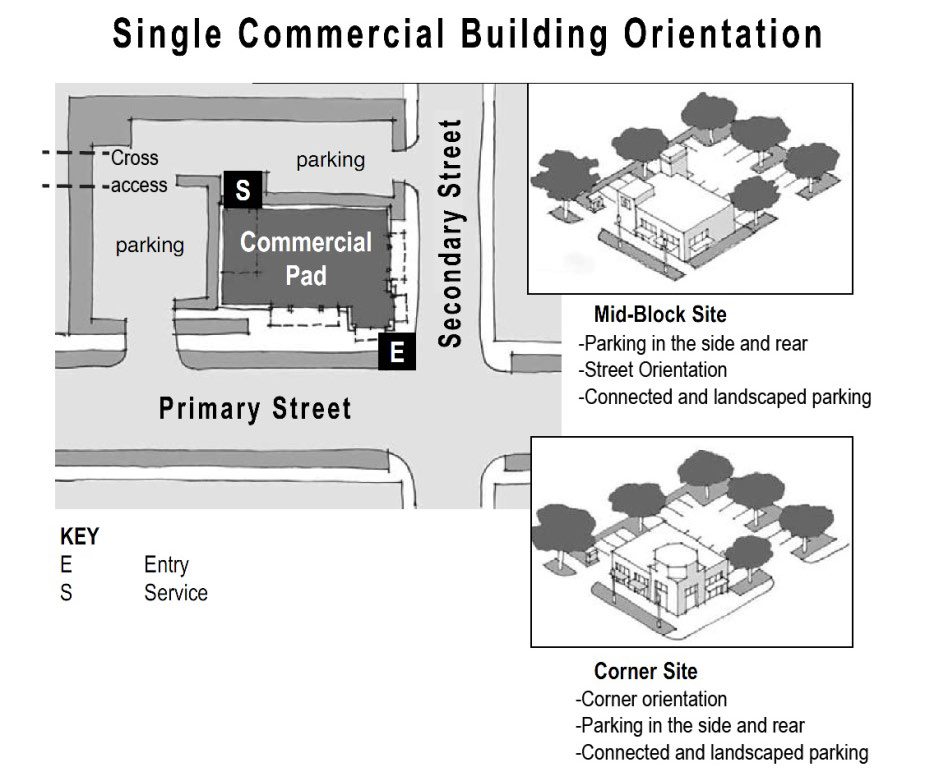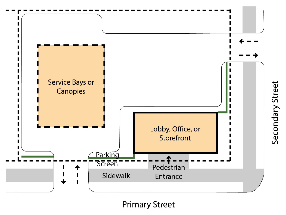 Whenever practical, if an alley is present and open to traffic, all vehicular access should take place from the alley. When an alley is not present, access to corner lots from a secondary street is preferable to access from a primary street.