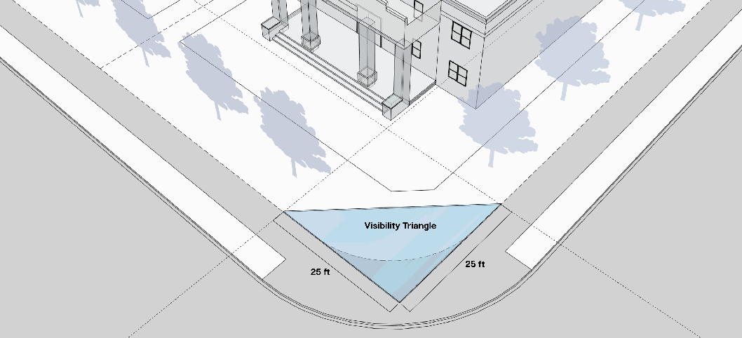 No fence erected under the above provisions, and no wall, screen hedge, tree, brush, shrub, billboard or structure shall be erected, planted or maintained in such position or place so as to be dangerous or detrimental to the health or safety of persons living in any house or adjoining premises or in any way obstruct the view so as to constitute a traffic hazard. On any corner lot or parkway adjacent thereto, no fence, wall, structure, hedge, tree or growth of any nature may be erected, planted or maintained so as to interfere with sight lines at elevation between two and a half feet and eight feet above the top of the adjacent roadway curb. If there is no curb then from the center of the street (the crown) shall be constructed to be the same height of a curb. Such an obstruction shall be prima facie evidence that such fence, wall, structure, hedge, tree or growth of any nature constitutes an obstruction to vision as regards public traffic on the streets, except post, poles and tree trunks of less than 12-inch diameter within the triangular line of sight easement. The triangular visibility area is defined as the intersecting point from a property former extending back 25 feet and connecting the area and as depicted below.