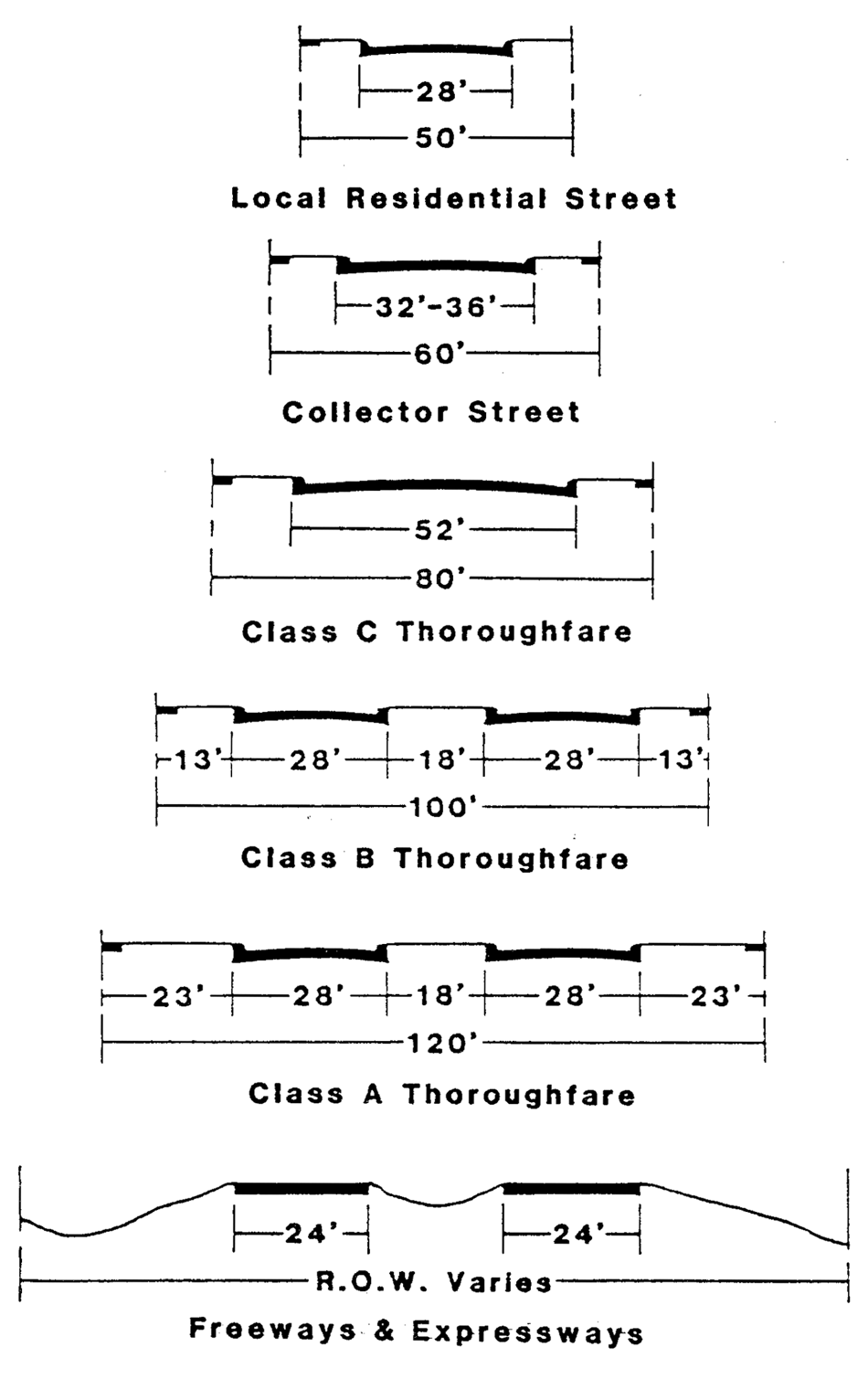 Class A thoroughfares. The proposed right-of-way of a class A thoroughfare is 120 feet. These are thoroughfares having up to six lanes with a traffic handling capacity of up to 40,000 vehicles per day. Medians may be required and such streets may be selectively developed as parkways. The following are class A thoroughfares: