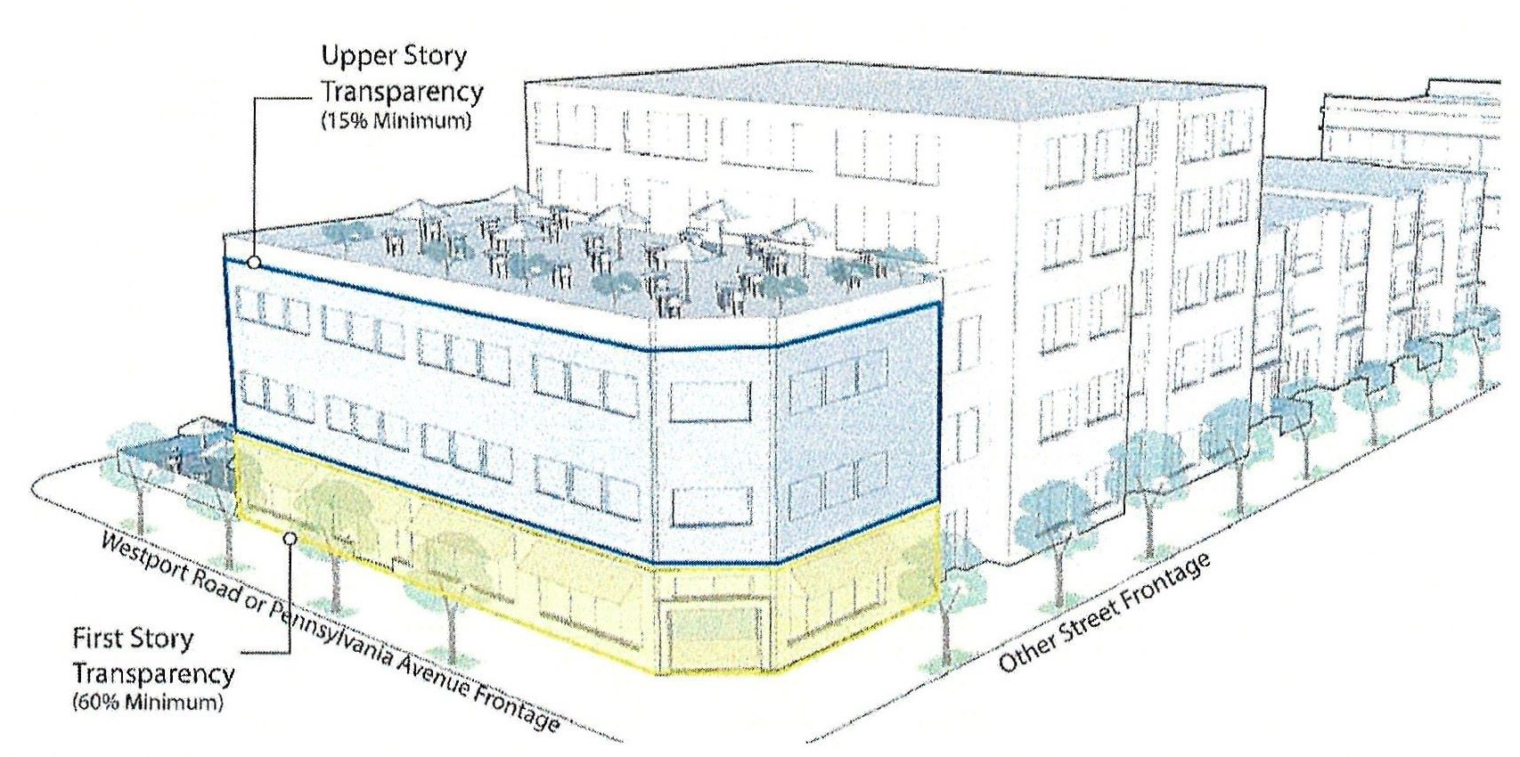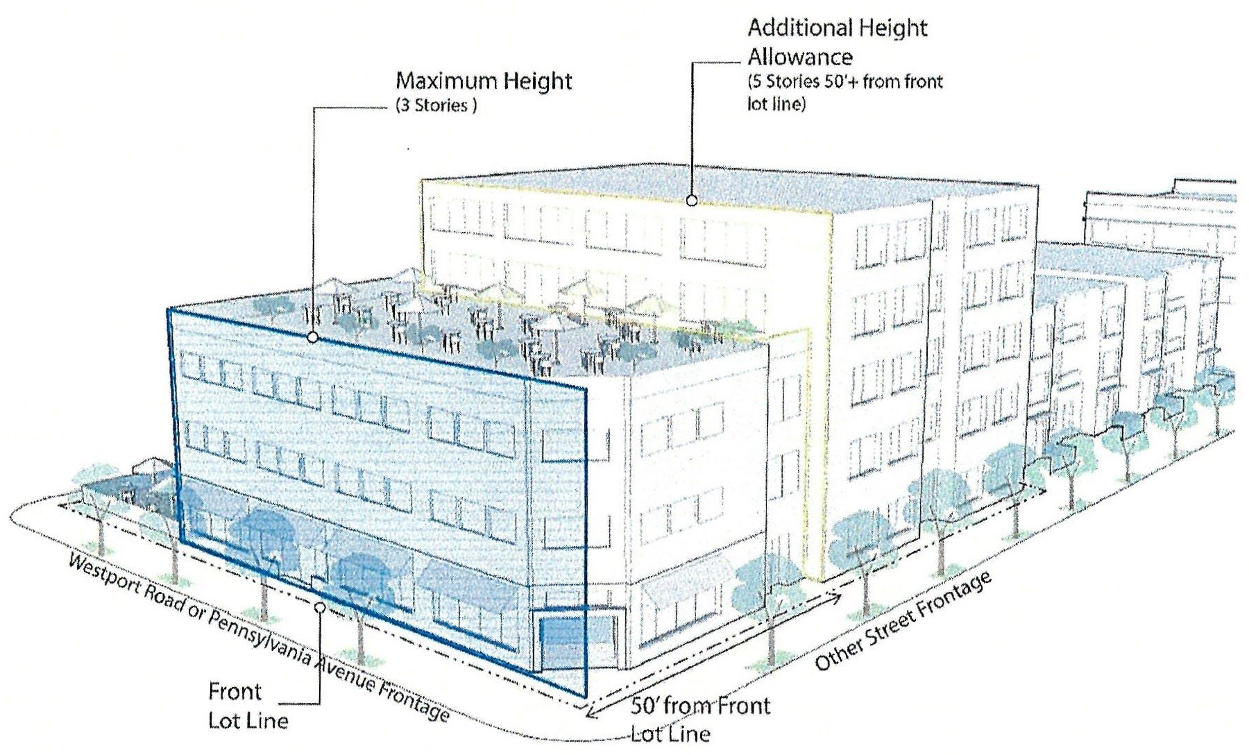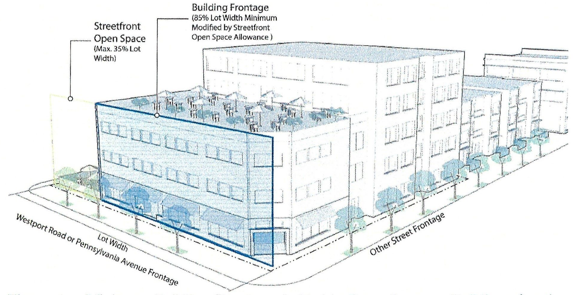 Open space shall not exceed 35% of the total lot frontage along Westport Road and/or Pennsylvania Avenue.