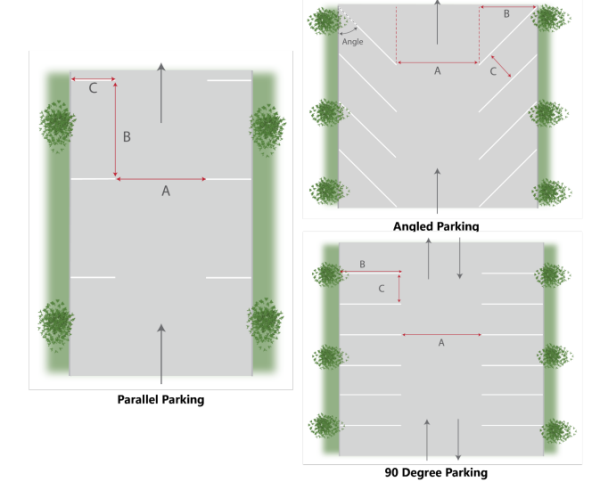 | Angle (Xº) | Minimum Aisle Width (A)* | Stall Depth (B) | Stall Width (C) |