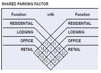 The shared parking factor for two (2) functions (the number indicated in the corresponding triangular box below), when divided into the total spaces required by Keego Harbor on any particular lot, produces the effective parking needed for that lot. Parking may be also shared in this manner across lot ownership by agreement.