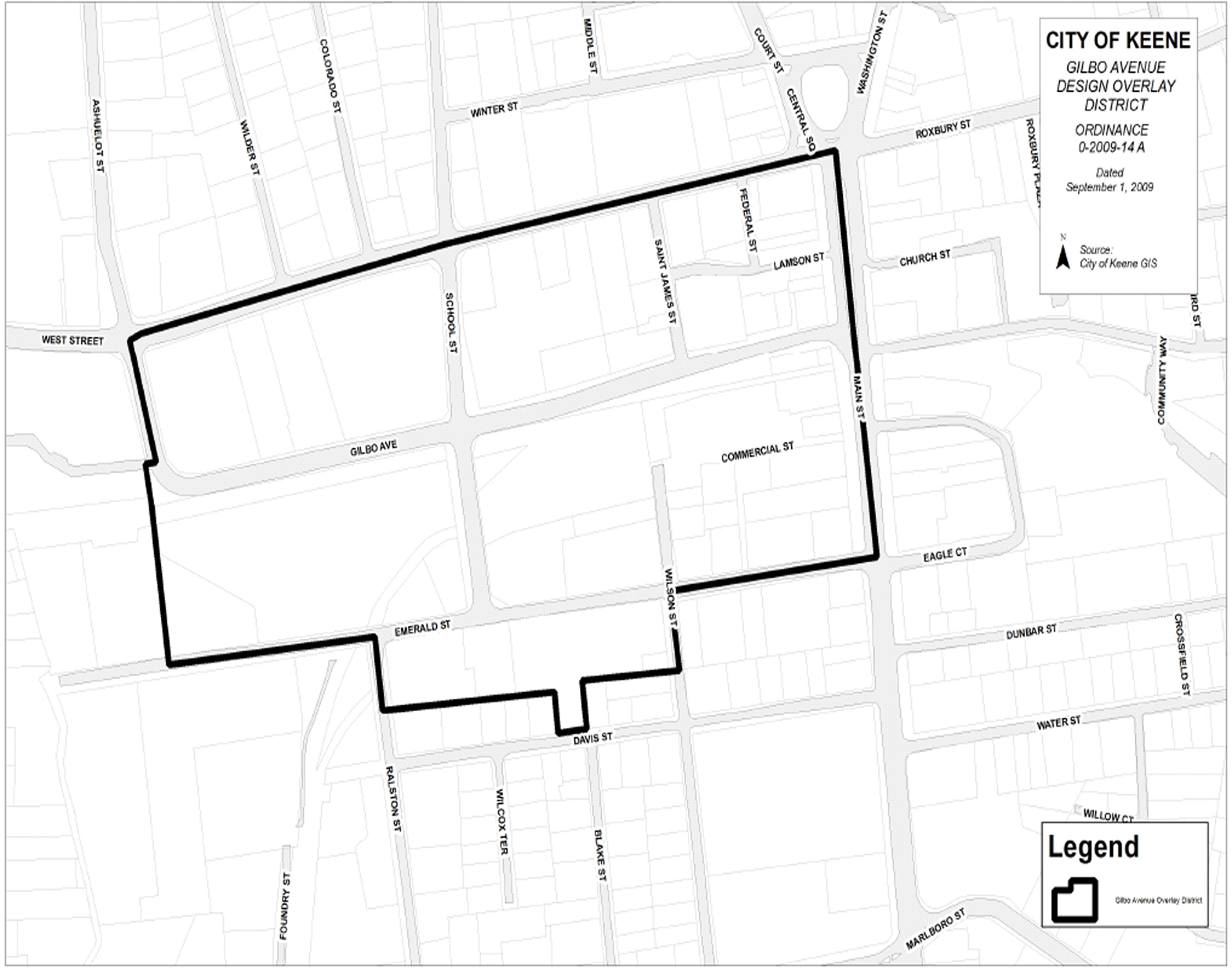 Incorporated as part of this article, the Gilbo Avenue Design Overlay District, as described in a map entitled, "Gilbo Avenue Design Overlay District" dated September 1, 2009, is hereby adopted as an overlay to the official zoning map of the City of Keene.