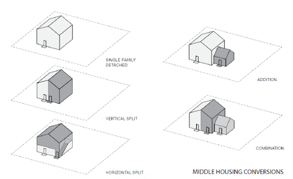 Middle housing conversions. A conversion from a single-family home to a duplex, triplex, quadplex, or cottage cluster is allowed. The following requirements and standards apply: (6/22)