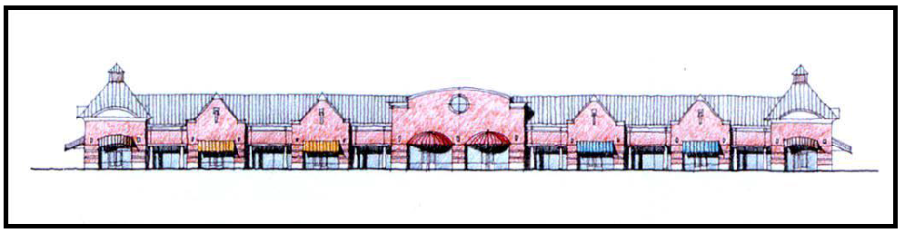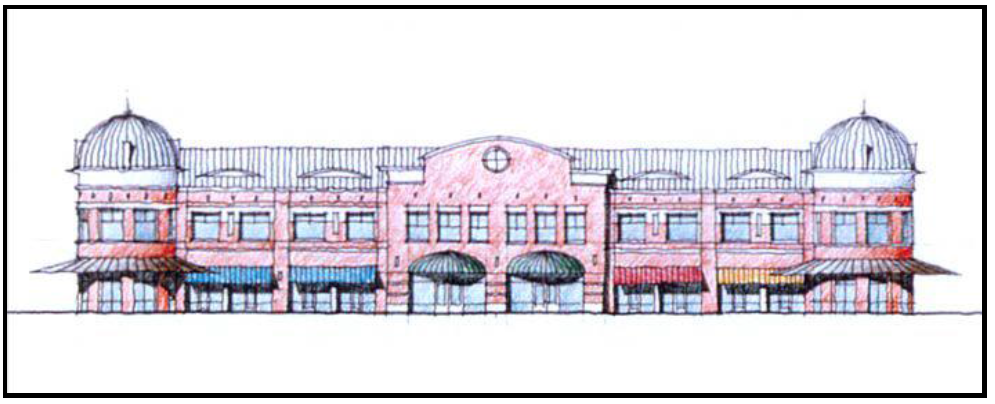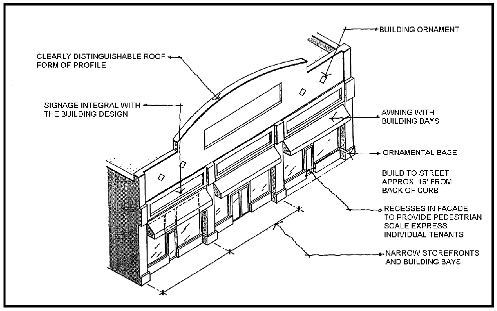 Buildings shall have a long and low building form with strong horizontal lines. Windows in geometric shapes and/or glass storefront may be arranged in ribbons to emphasize the horizontality of the overall building design.