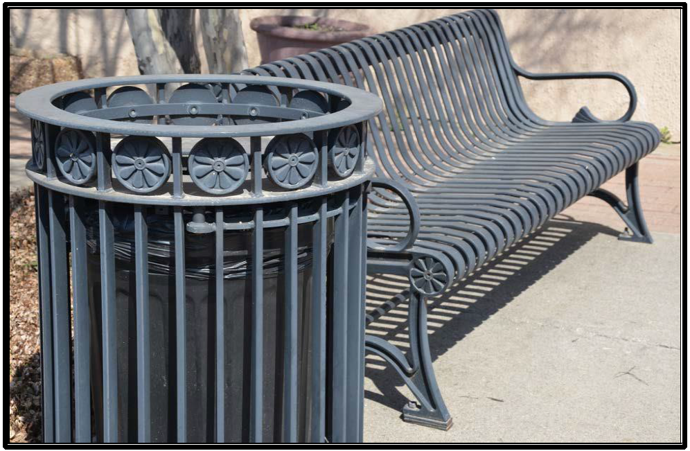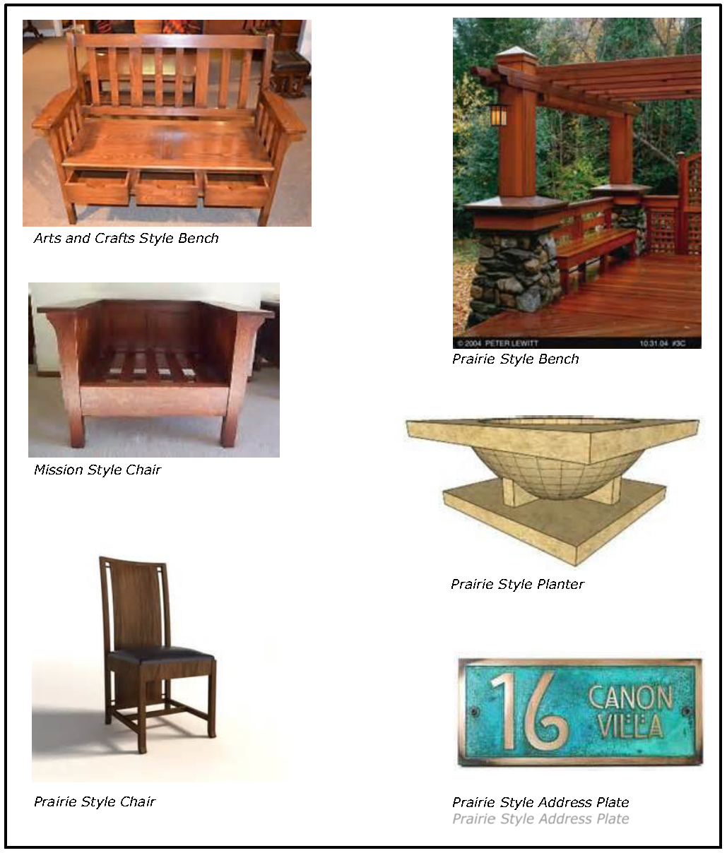 Street furniture is encouraged at building entrances and along walks. Street furniture, if used, shall be Prairie, Mission, or Arts and Crafts styles.