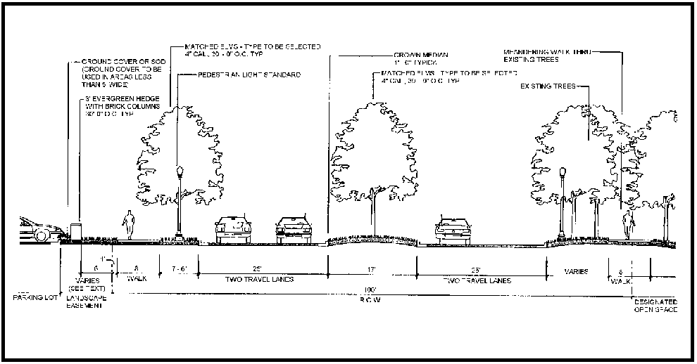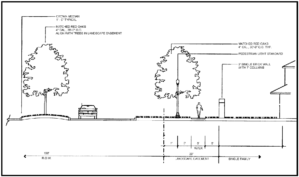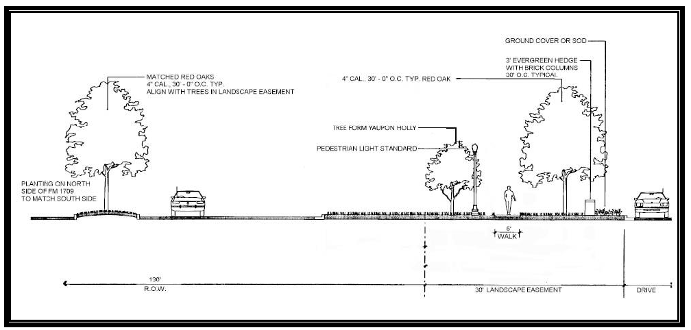 The required canopy trees for landscape buffers adjacent to thoroughfares shall not be placed in a linear arrangement with consistent spacing, but shall be in a random, free- form, and/or clustered arrangement.