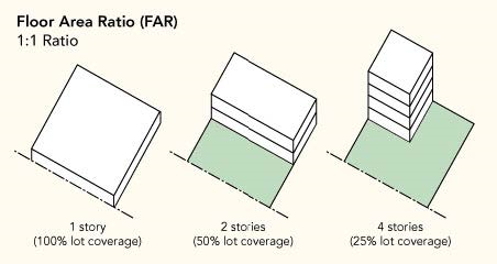 Floor Area Ratio (FAR): The floor area of a building or buildings on a lot divided by the lot area.