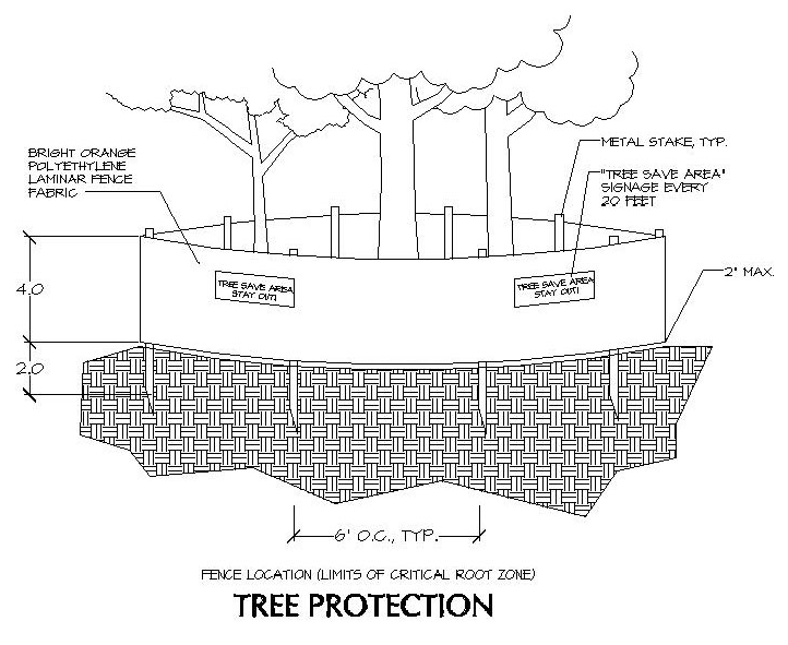 Tree protection devices shall be installed prior to the issuance of a land use permit for any clearing and/or grading. Tree protection shall consist of chain link fencing, orange laminated plastic fencing supported by posts, rail fencing, or other equivalent restraining material. Tree protection devices shall remain in functioning condition throughout all phases of development and shall be subject to inspection by the Director. (See Figure).