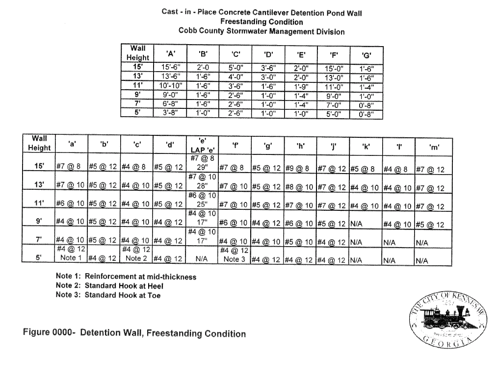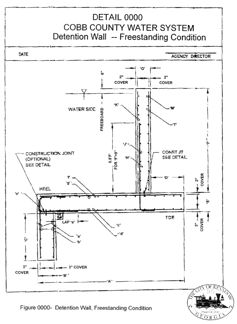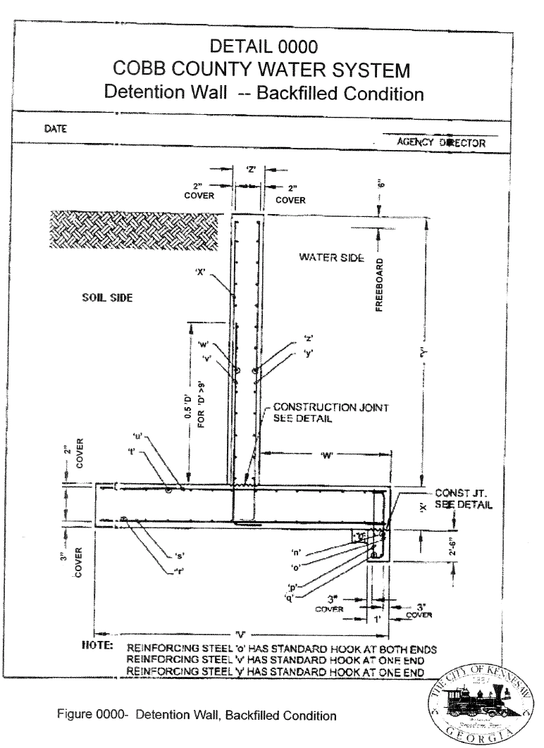 Retaining walls that are proposed for the purpose of storm water detention must be designed to demonstrate that the walls are capable of a hydrostatic load as measured from the top of the foundation footing to the highest elevation along the top of the wall. The hydrological design must allow for a free board dimension of one foot and an emergency overflow capacity equal to the allowable peak discharge for the 100-year storm event. The routing calculations should not take into account the existence of the emergency overflow. Place the overflow device above the projected 100-year flood elevation within the detention area.