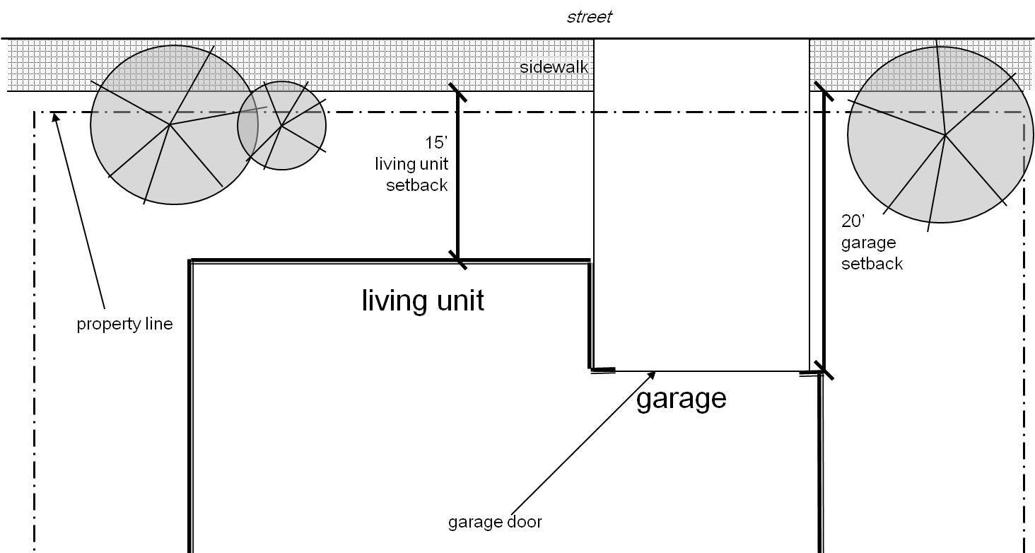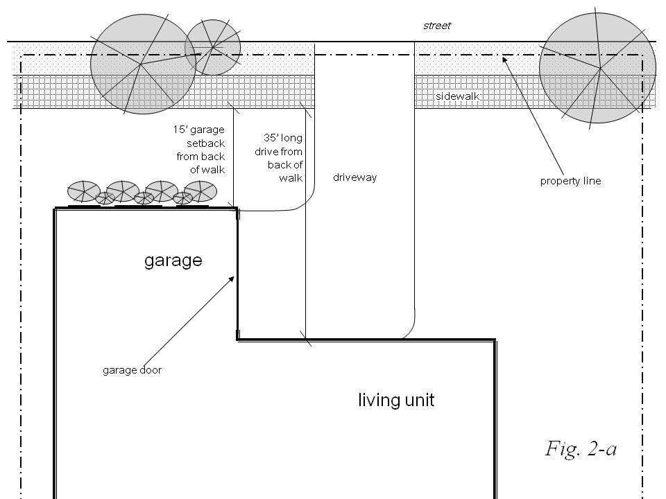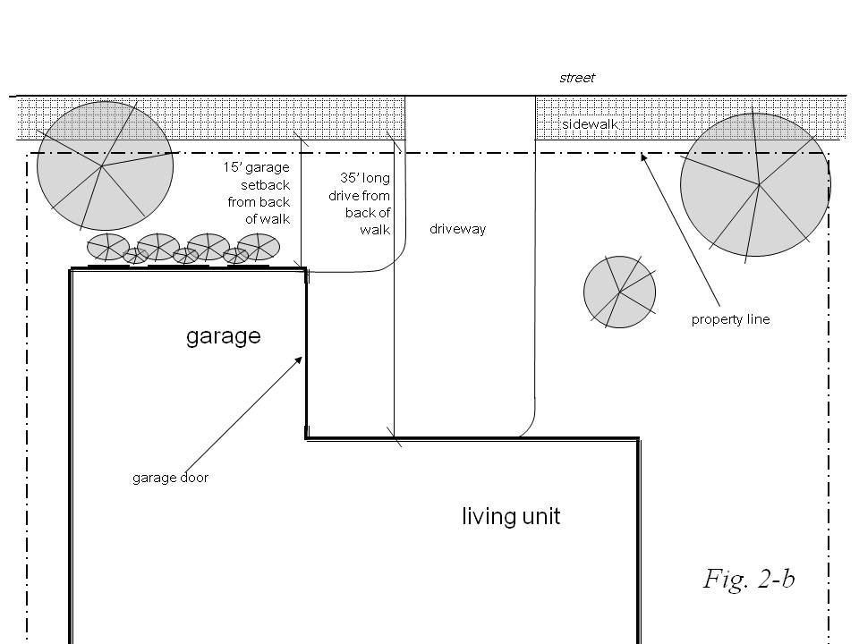For garages that face a no-street abutting property line (side-entry garages,) the garage setback may be reduced to 15 feet from the back of the sidewalk. The street facing façade of the garage shall be treated with windows, modulations and/or architectural design elements and features that mimic the remainder of the house. Landscaping shall also be required along the street-facing façade. (See fig. 2a-b)