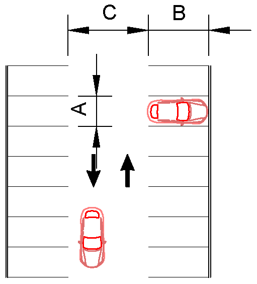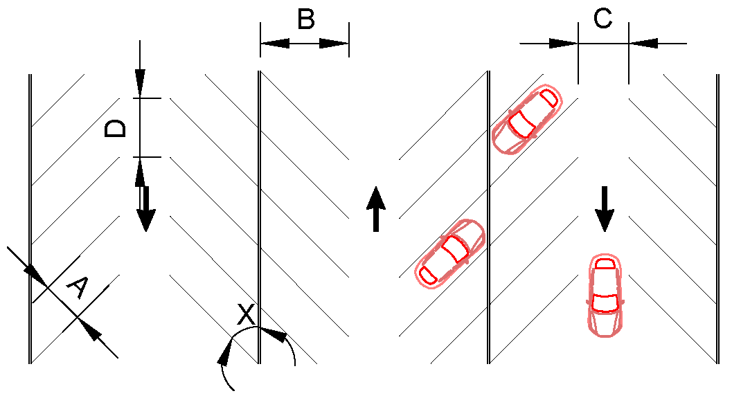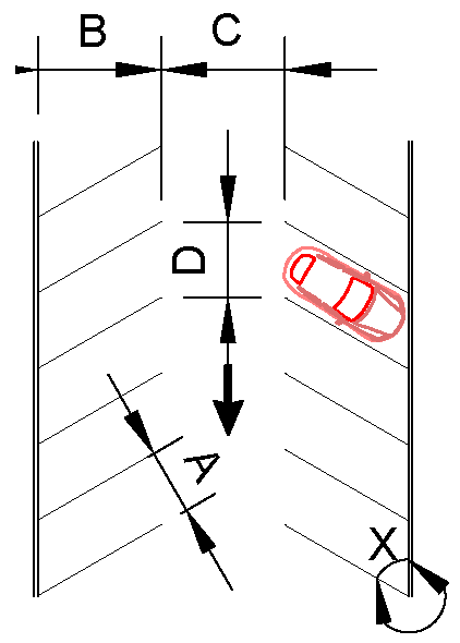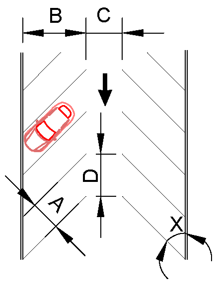 | X° | Stall Width (A) | Stall Depth (B) | Aisle Width (C) | Skew Width (D) |