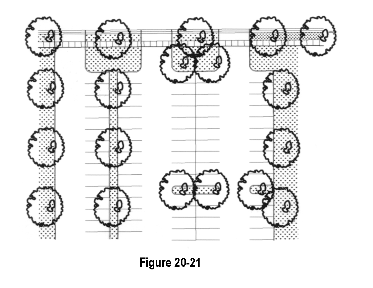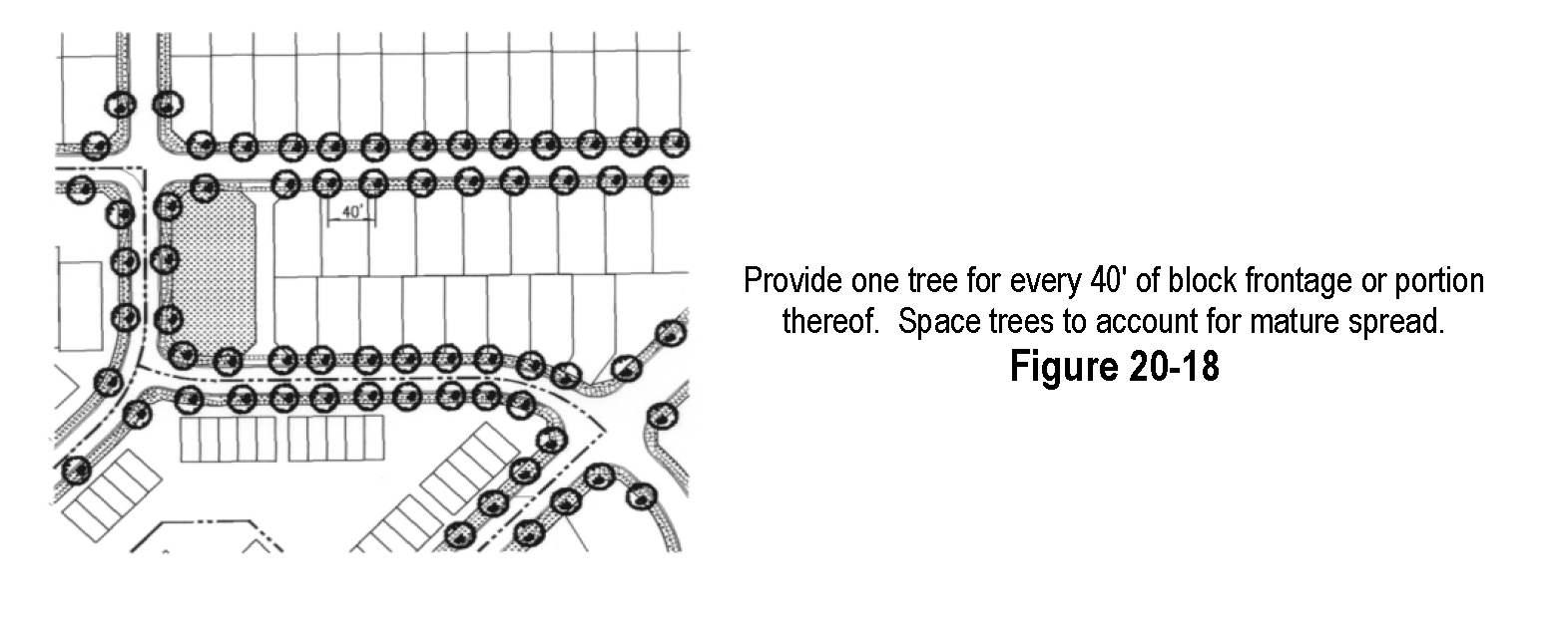 Street trees placed in new developments at regular intervals of thirty to forty (30 to 40) feet and placed directly adjacent to sidewalks. See Figure 20-18, Section 20-16.C.