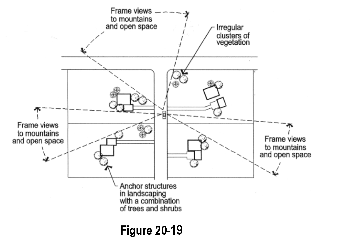 Fit Within the Environment Rather Than on Top of It. New developments shall be designed to respond to the natural environment, fit into the setting and protect scenic view corridors. Key design considerations shall include a site layout that responds to natural features both on- and off-site, the size of structures and materials used in the development and the transition between the development and the surrounding landscape.