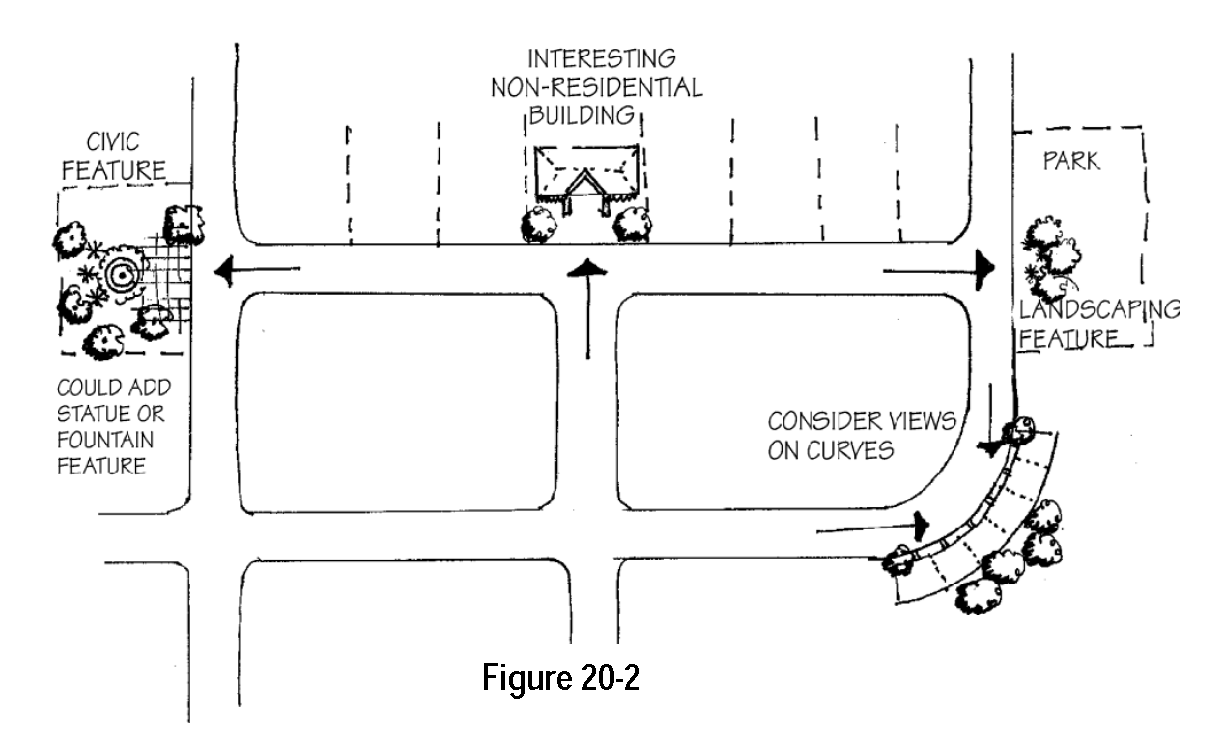 Focal Points. Focal points, or points of visual termination, shall generally be occupied by more prominent, monumental buildings and structures that employ enhanced height, massing, distinctive architectural treatments, or other distinguishing features, as well as landscape features. See Figure 20-2.