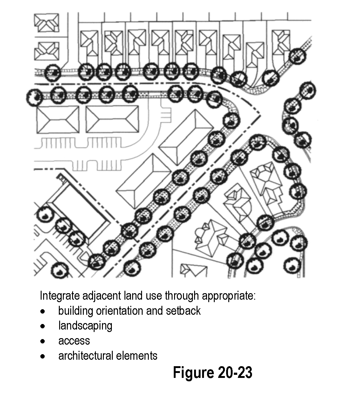 Intent. To encourage the creation of viable neighborhoods that interconnect with each other and integrate new projects into the existing community, thereby strengthening the original town. The neighborhood layout should consider the street, lot and block pattern of the original town, as well as solar orientation, topography, sensitive wildlife habitat and vegetation, drainage patterns, and environmental and regional climate issues. Further, the edges of neighborhoods should be formed by features shared with adjacent neighborhoods such as major streets, changes in street pattern greenways or natural features such as streams and major drainage or riparian corridors. New streets, bikeways, sidewalks, paths, and trails should connect to existing adjacent neighborhoods.