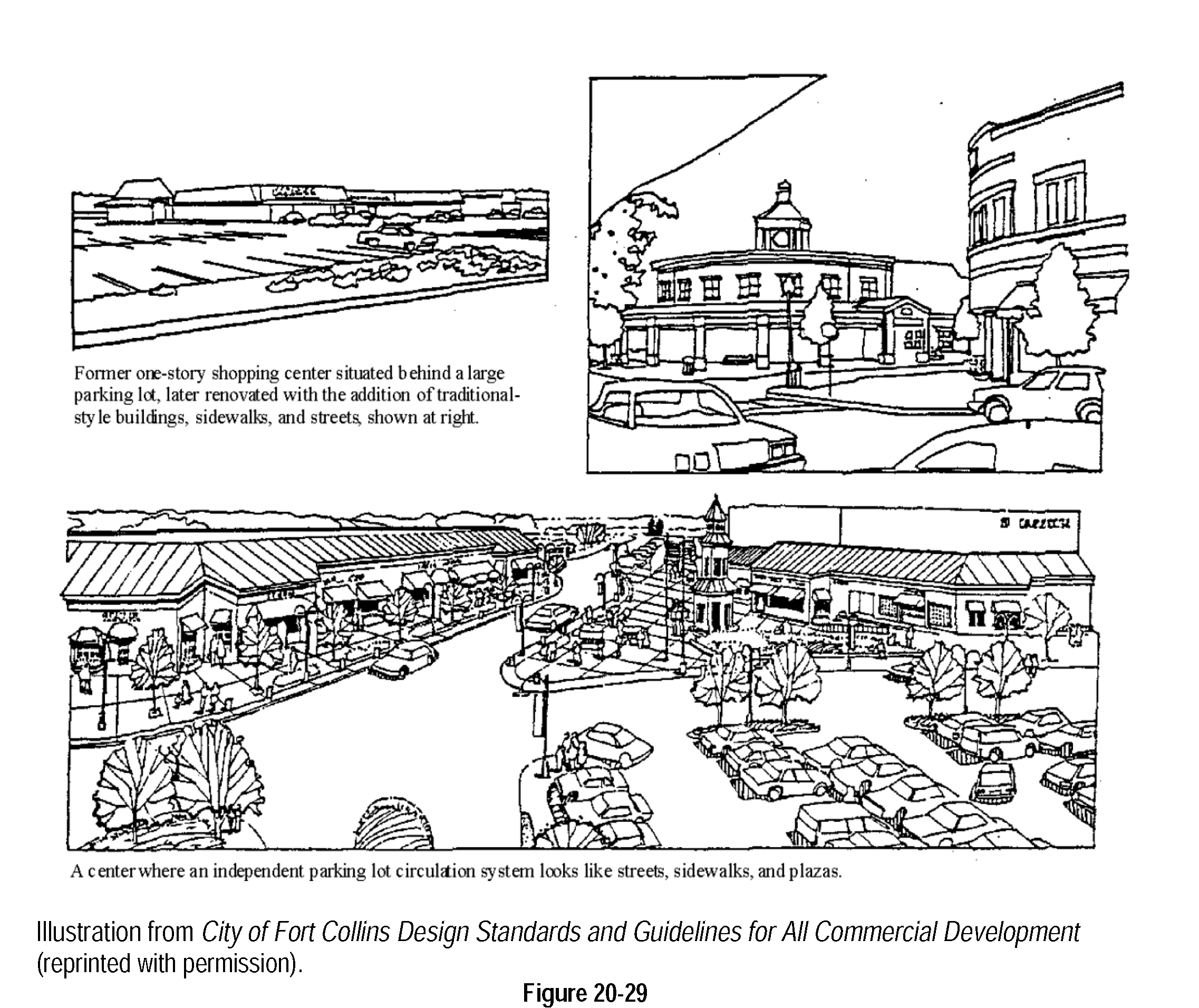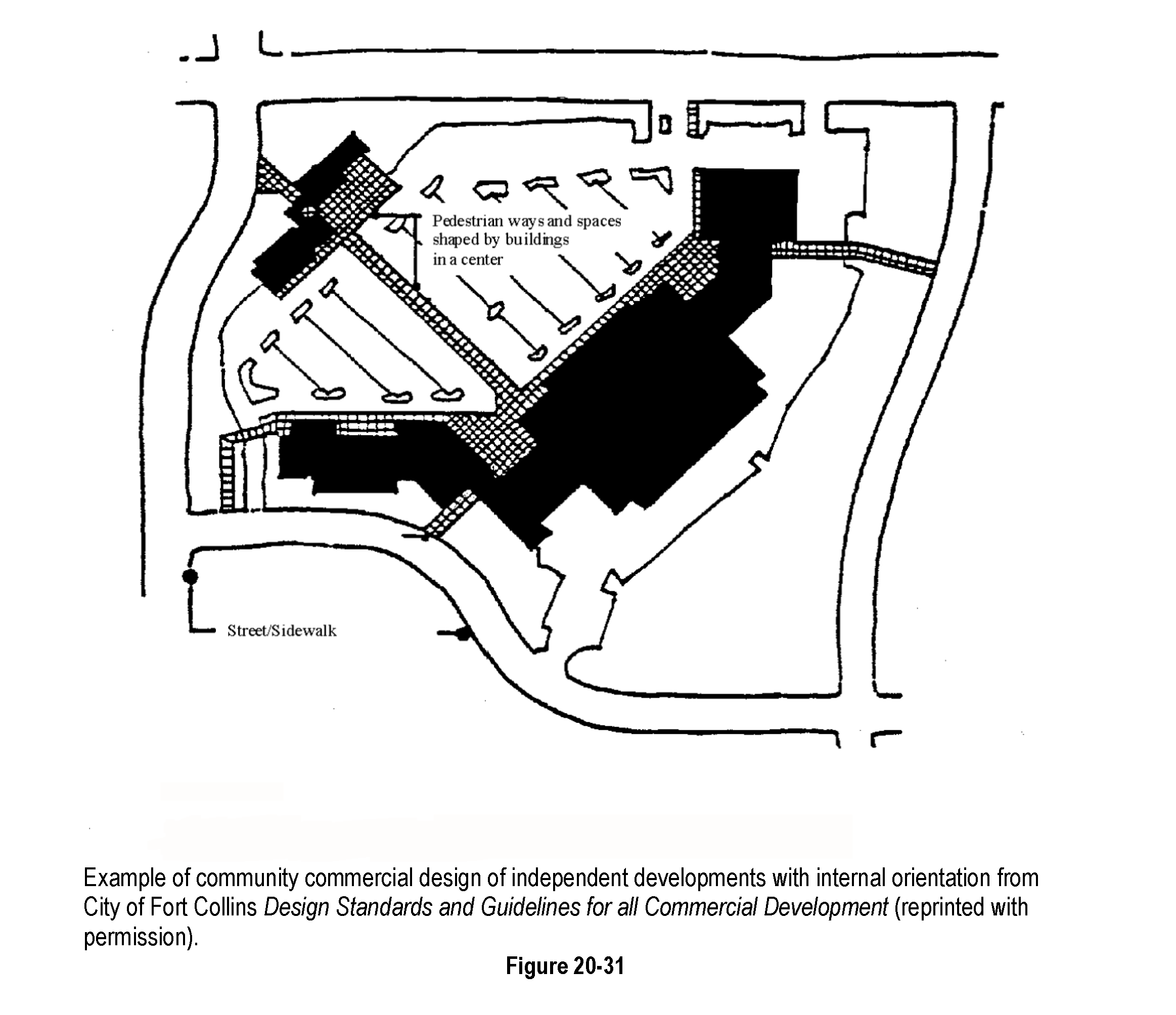 Pedestrian Scale. The establishment of buildings on isolated "pad sites" surrounded by parking lots and driveways, and that offer mainly auto-oriented signage to define entrances, is discouraged. Even relatively massive development can be configured into "blocks" or other spaces, proportioned on a human scale and city block scale; and need not be proportioned on a monolithic, auto-oriented scale.