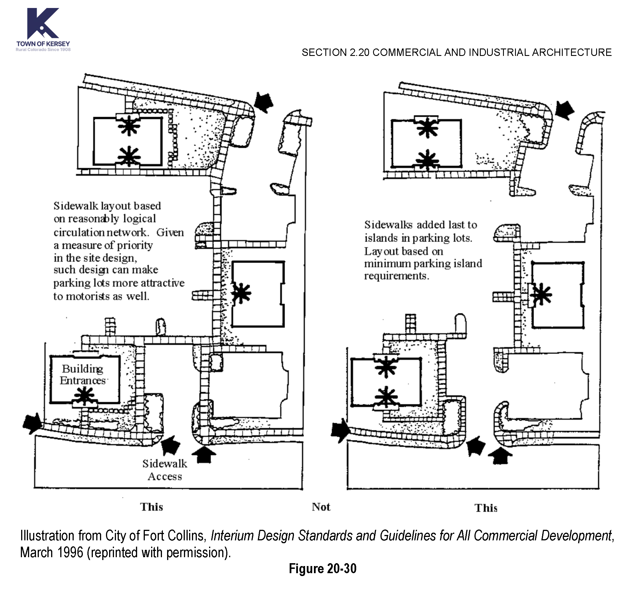 Connections. Commercial developments must be linked with surrounding areas by extending town streets, sidewalks and/or paths directly into and through the development, thereby providing convenient, direct pedestrian, bicycle and vehicle access to and from all sides of the development.