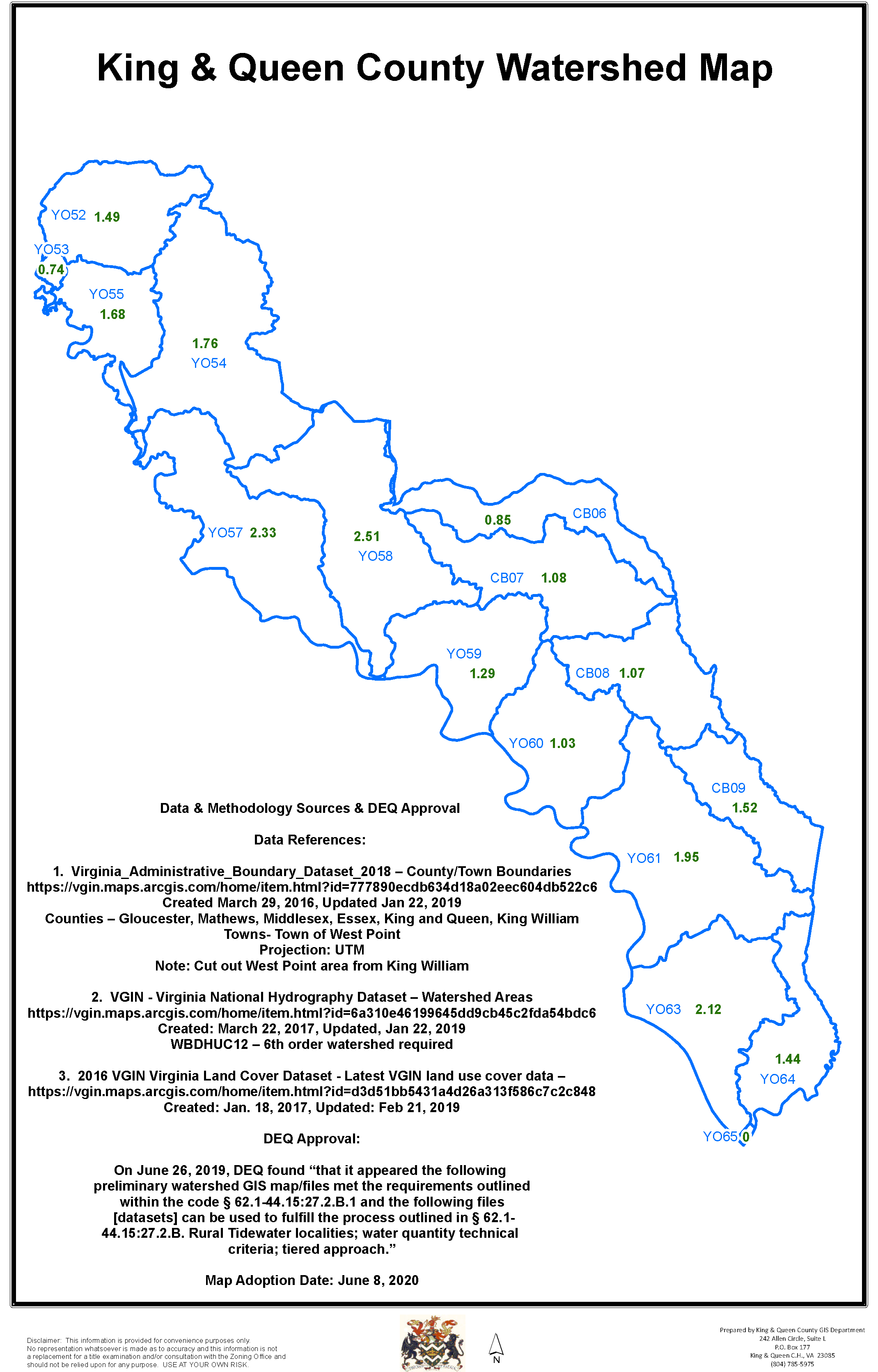 King and Queen County hereby adopts a watershed map (dated June 8, 2020). The watershed map illustrates the county boundaries, the boundaries of each watershed located partially or wholly within the county boundary, the percentage of impervious cover within each watershed, within the county boundary, and locations where development is expected or proposed to occur. A copy of the watershed map shall be filed in the office of the clerk of the circuit court.