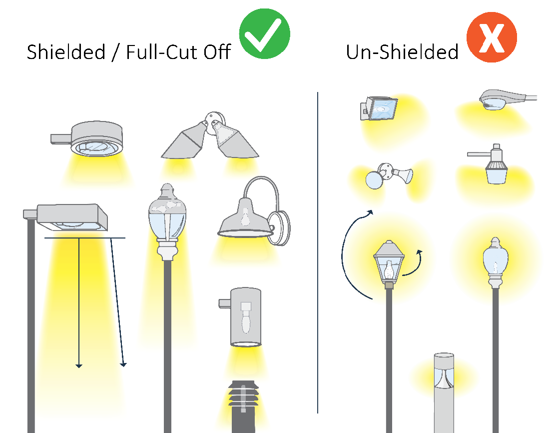 Shielding. Each outdoor luminaire subject to these outdoor lighting requirements shall be dark sky compliant with a full cutoff luminaire and aimed and controlled such that directed light is directed inward to the property and confined to the object intended to be illuminated. Directional control shields shall be used when necessary to limit stray light and prevent glare to adjacent properties and vehicular public rights-of-way.