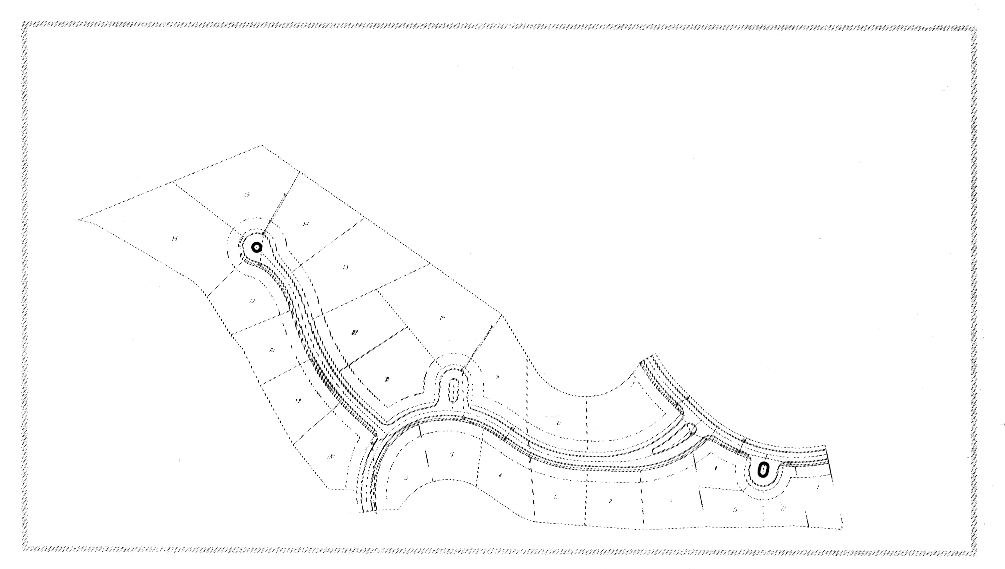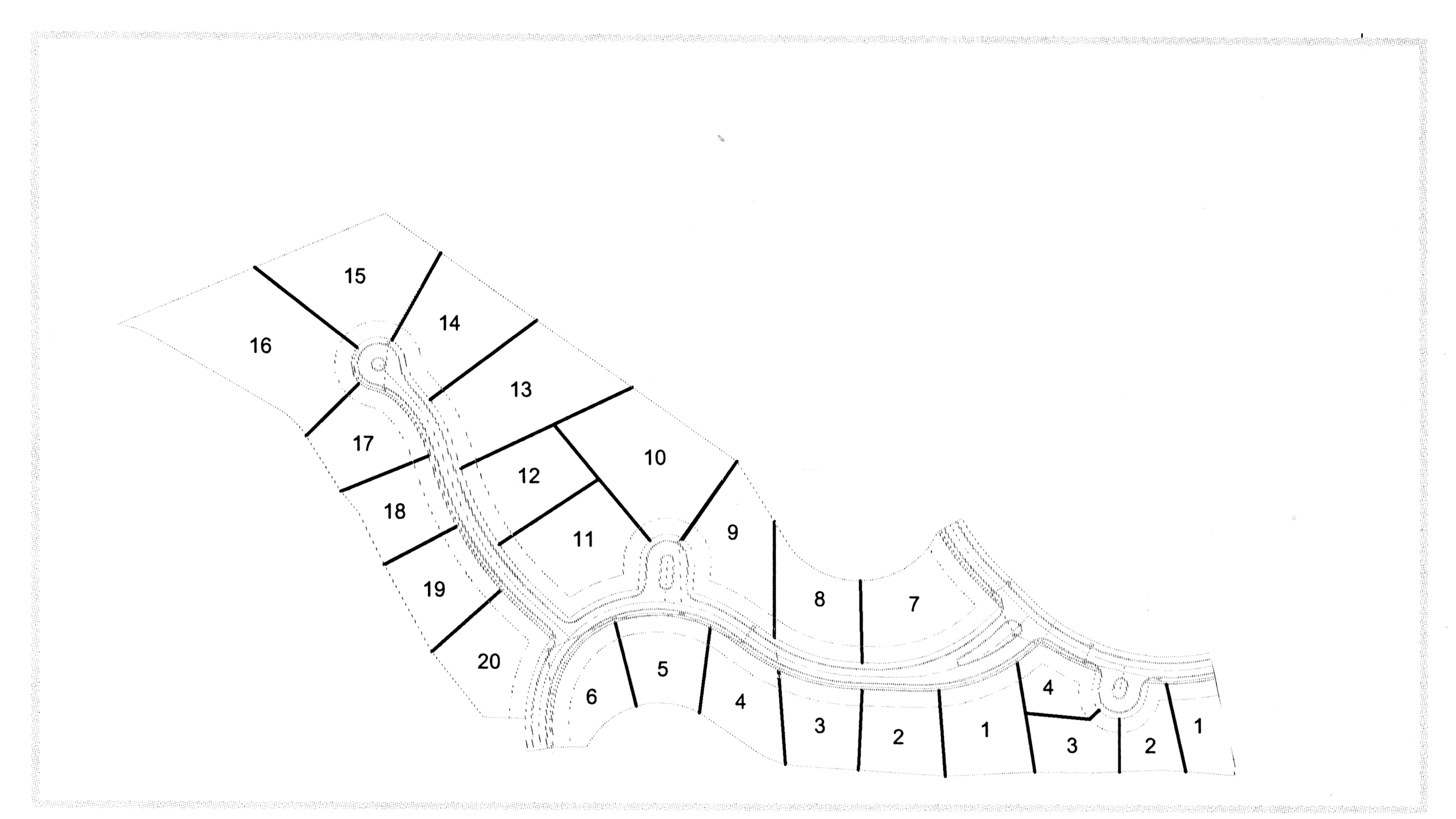 This line or set of lines creates the outer boundary of each block within a subdivision. Block boundaries are generally formed by a combination of right-of-way lines and the subdivision boundary. A block boundary may be further subdivided into many lots or it may not be further subdivided at all, as in the case of a common area such as a large street island or small park. It is also likely that the block boundary lines will be a set of lines that are duplicated on other drawing layers. These will usually be composed of right-of-way lines that bound a block. In this instance, this type of block boundary line will only be drawn if block numbering will be used as a part of the subdivision-block-lot legal description. (That is, the lots are described as lot 17 of block 2). If block numbering will not be used within the subdivision (and there are no common areas that will require a block designation), this layer is to be left blank.