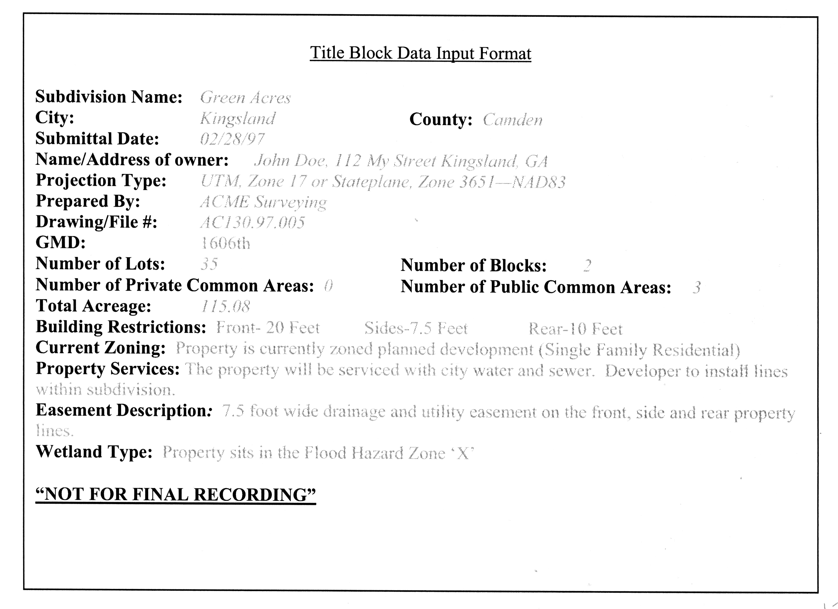 Following is the 'reserved layer' list that specifies the type of data to be drawn on each of the reserved layers: name, line type, color, width, font and text size specifications for any layers to be used in the description and filing of a subdivision plat within the City of Kingsland, GA. In addition to the layering specifications, some general specifications apply, as shown below.