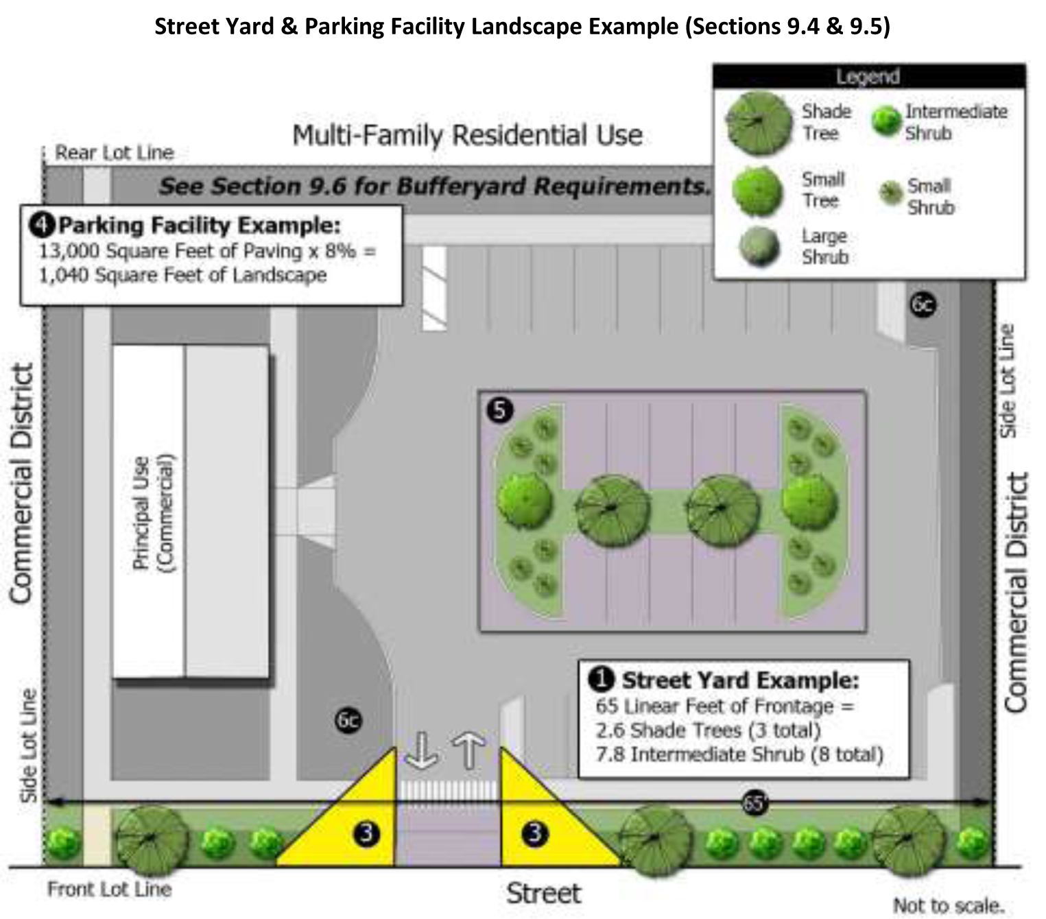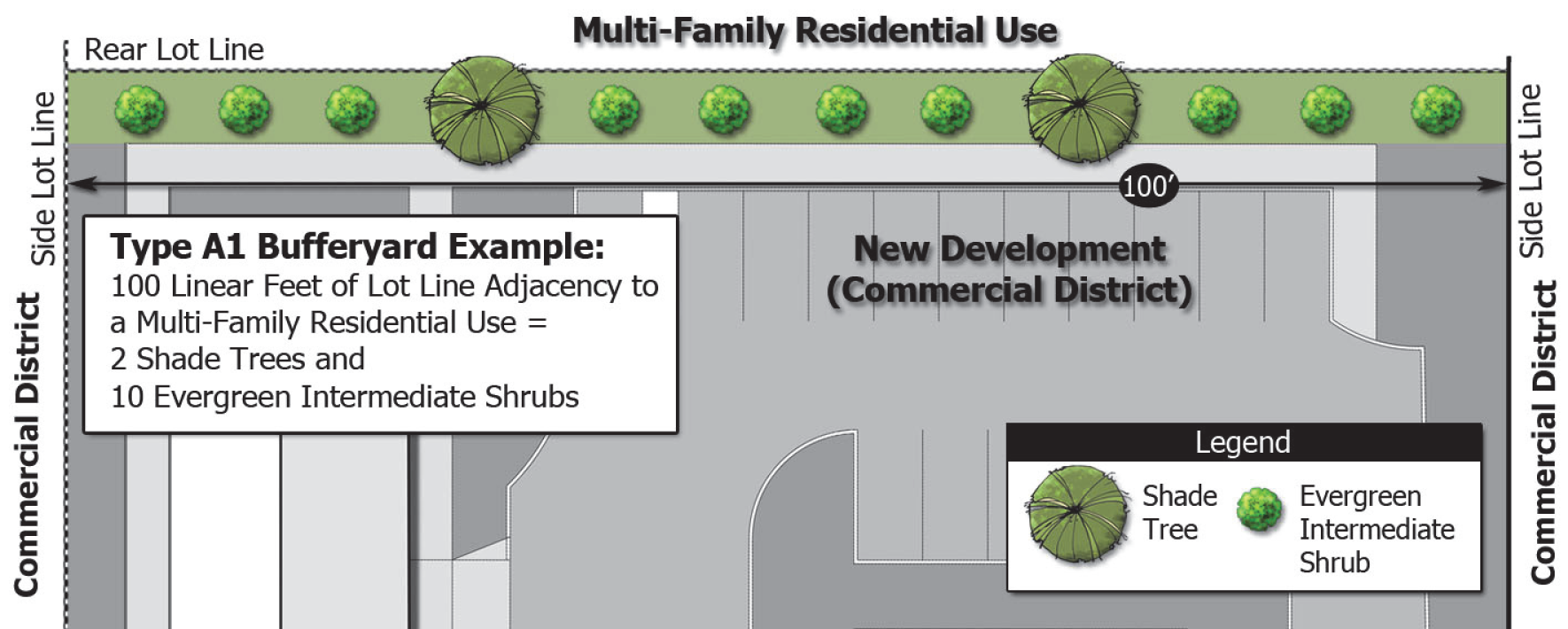 The following provides an example of a Type A bufferyard for a developed commercial district adjacent to a multi-family use in a residential district.