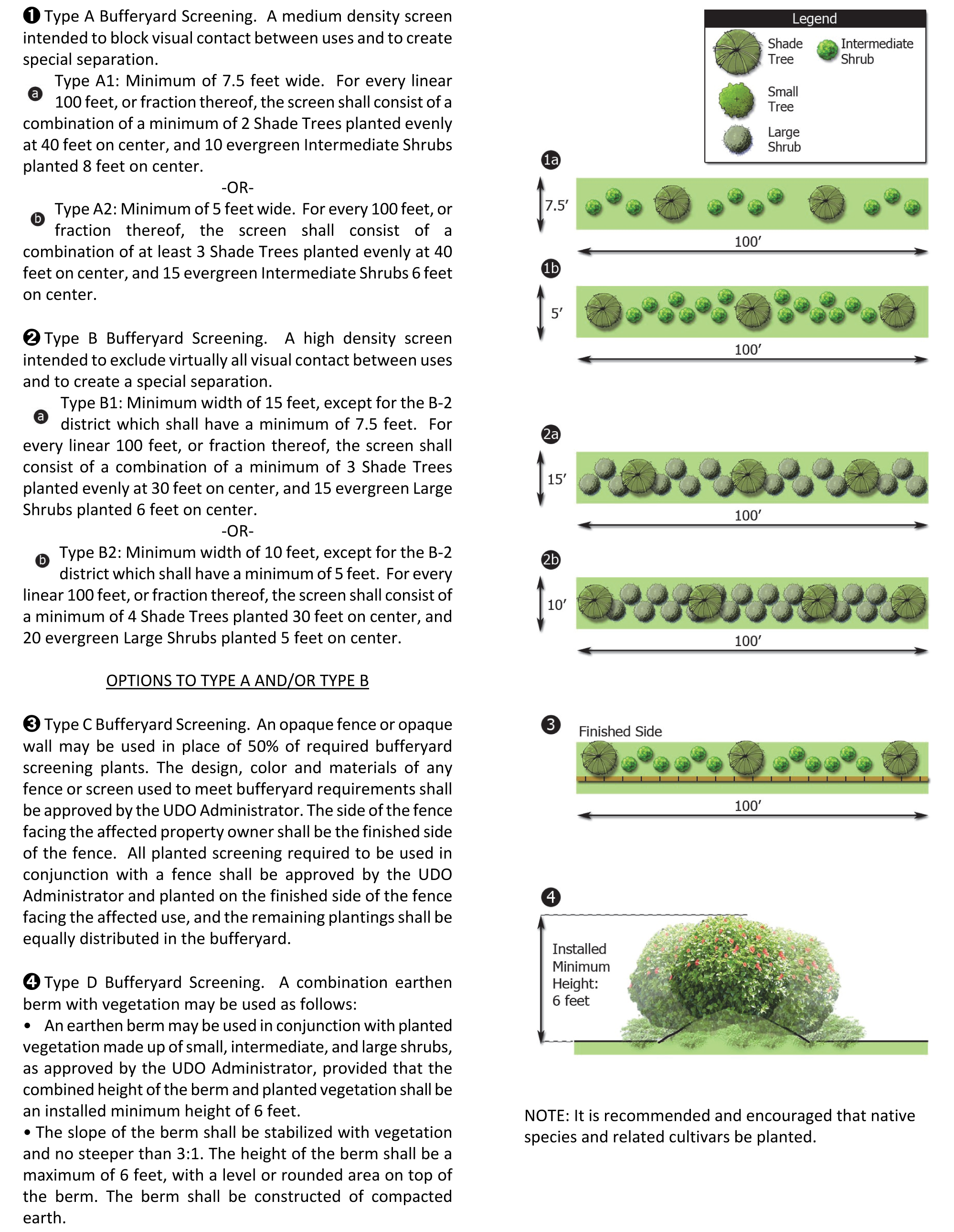 The following is a recommended plant list to be utilized in the preparation of landscape plans to meet vegetation requirements. Note: Native vegetation is preferred. Plants not listed may be accepted by the UDO administrator if they meet the standards defined by this section. Some plants are listed under multiple categories as many of these plants are offered in numerous varieties. Mature height and spread of each plant is contingent on the variety. It is highly recommended that landscape plans be prepared by or in consultation with a registered landscape architect or qualified landscape design professional.