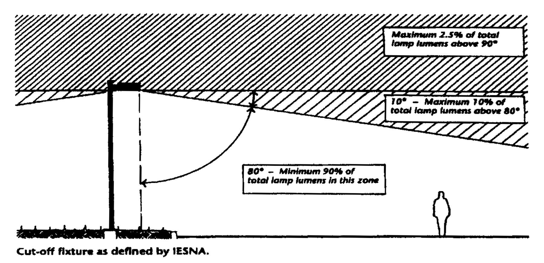 Cutoff fixture means a flat lens, full cutoff fixture that by its design, directs a minimum of 90 percent of total lamp lumens within 80 degrees of the vertical plane of the light fixture and a maximum of ten percent of the total lamp lumens above 80 degrees from the vertical plane, and no more than 2.5 percent of total lamp lumens above 90 degrees. Full cutoff fixtures must be installed in a horizontal position as designed.