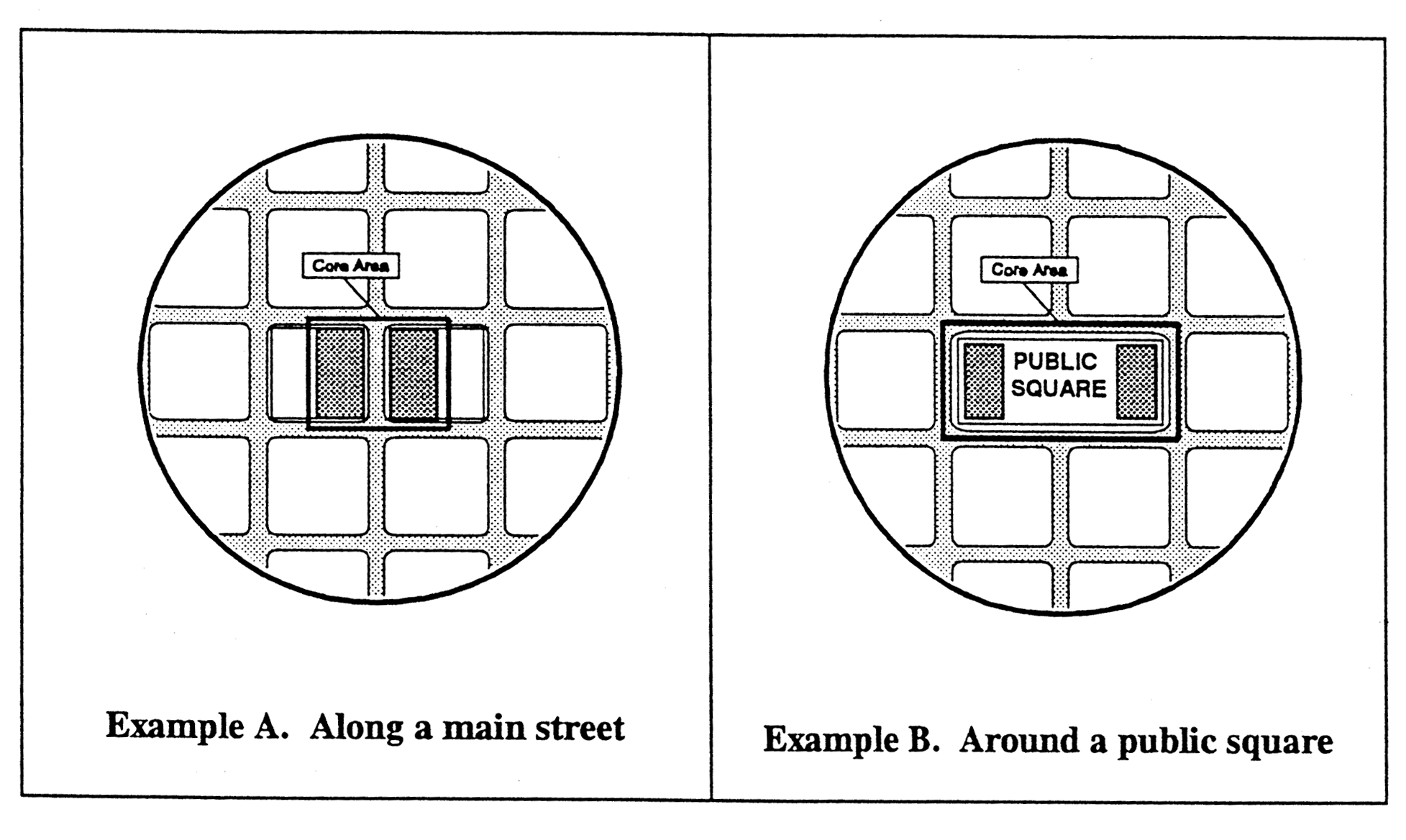 One (1) aisle of off-street parking with two (2) rows of parking may be considered in front of buildings that are not in the mixed use, "main street" portion of the core area which is the retail mixed use "main street core;" this would allow, for instance, a location for parking that would not compete with a natural feature that is on the site such as parking between a water body and a building.