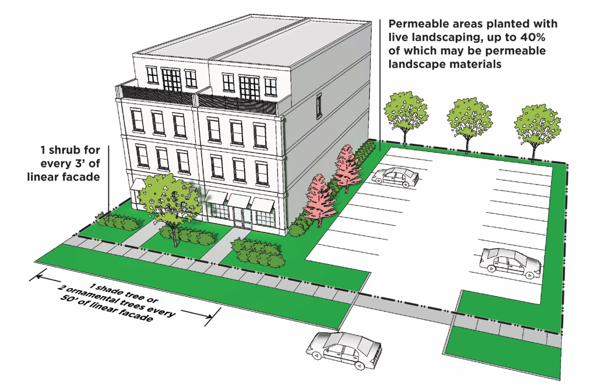 Where multi-family and nonresidential (including mixed-use) developments are located ten feet or more from a street lot line and no parking is located in front of the structure or development and where any façade abuts any parking area, foundation landscape must be planted as described below. This planting area is required along 60% of the linear façade area. This percentage may be reduced to accommodate entry design and other building functional operations during landscape plan review.