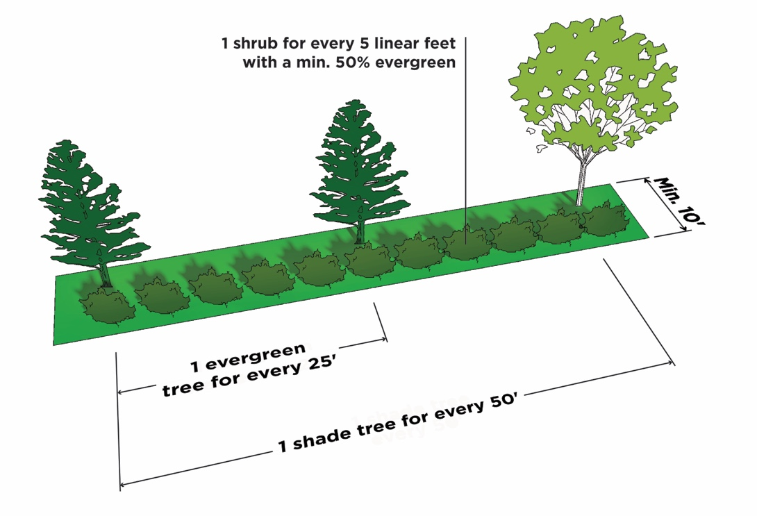 Minimum Required Trees: One evergreen tree for every 25 feet and one shade tree for every 50 feet.