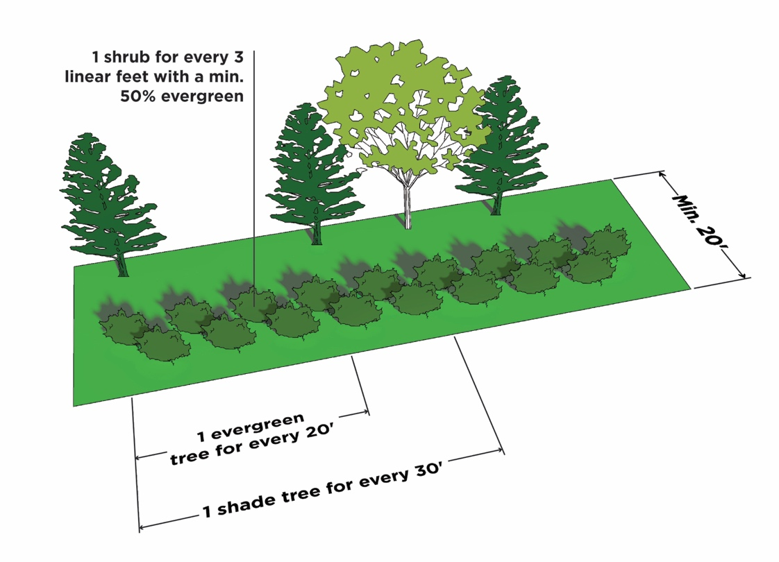 Minimum Required Trees: One evergreen tree for every 20 feet and one shade tree for every 30 feet.