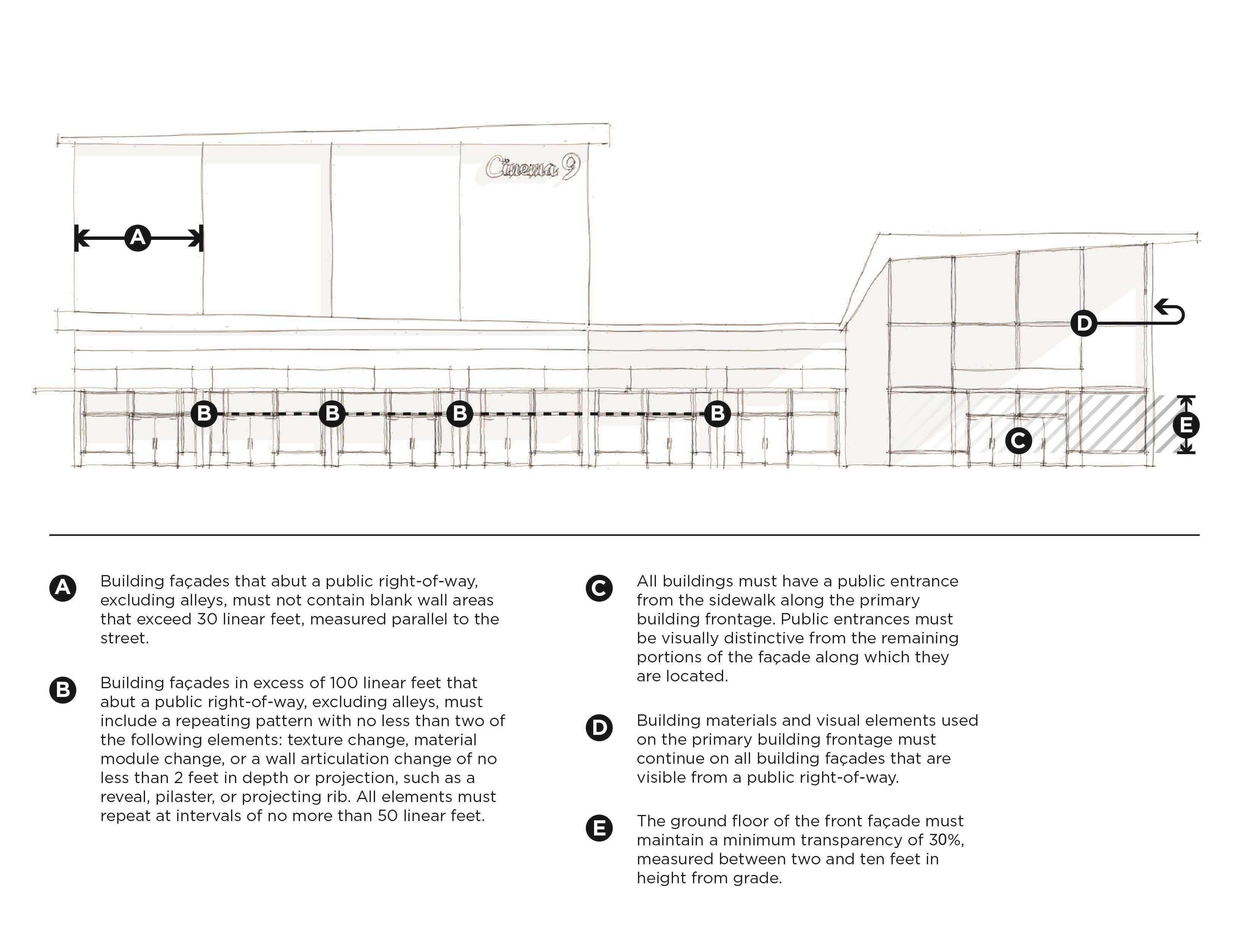 Building design elements incorporate pedestrian-scale features, such as awnings and storefront windows.