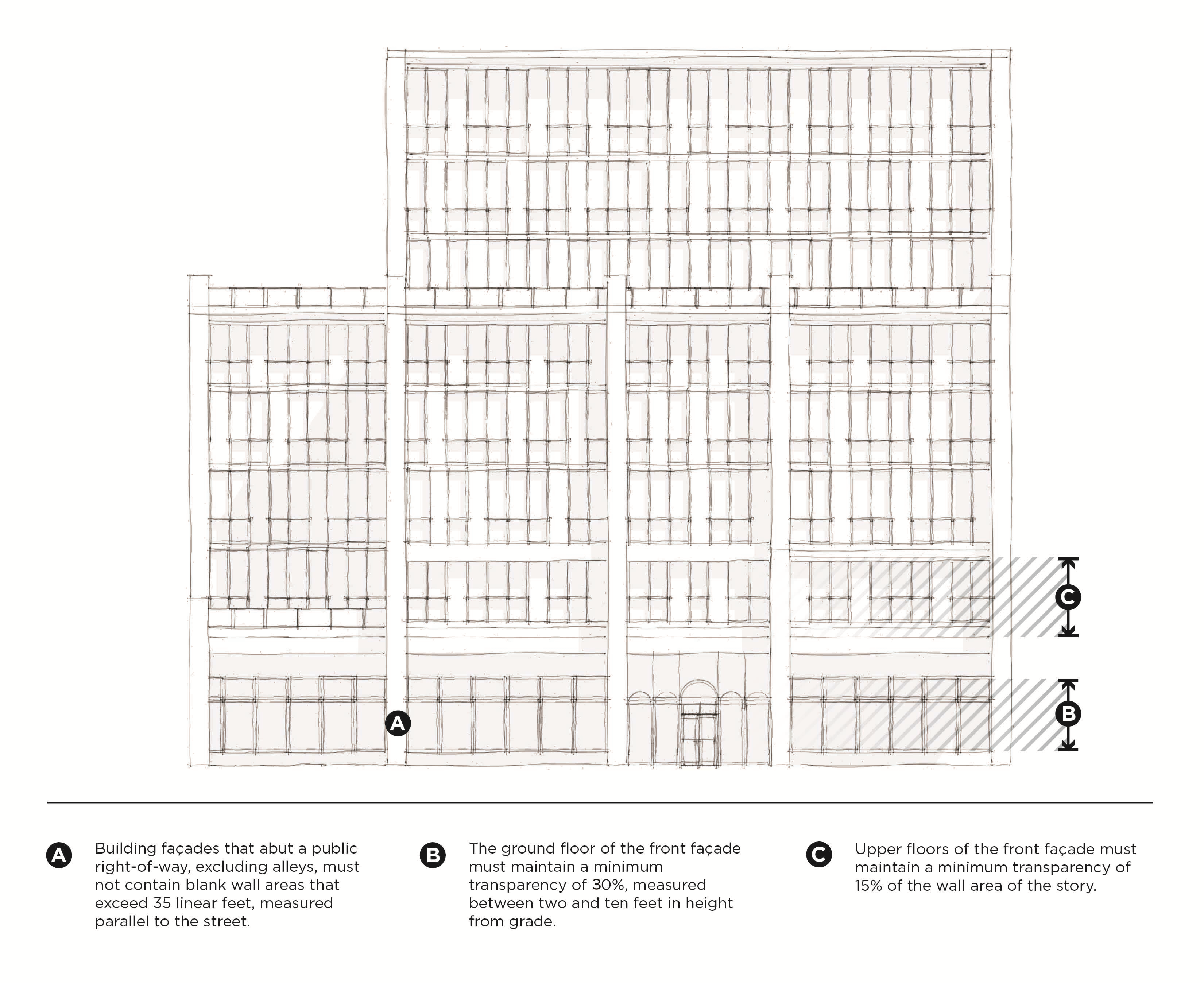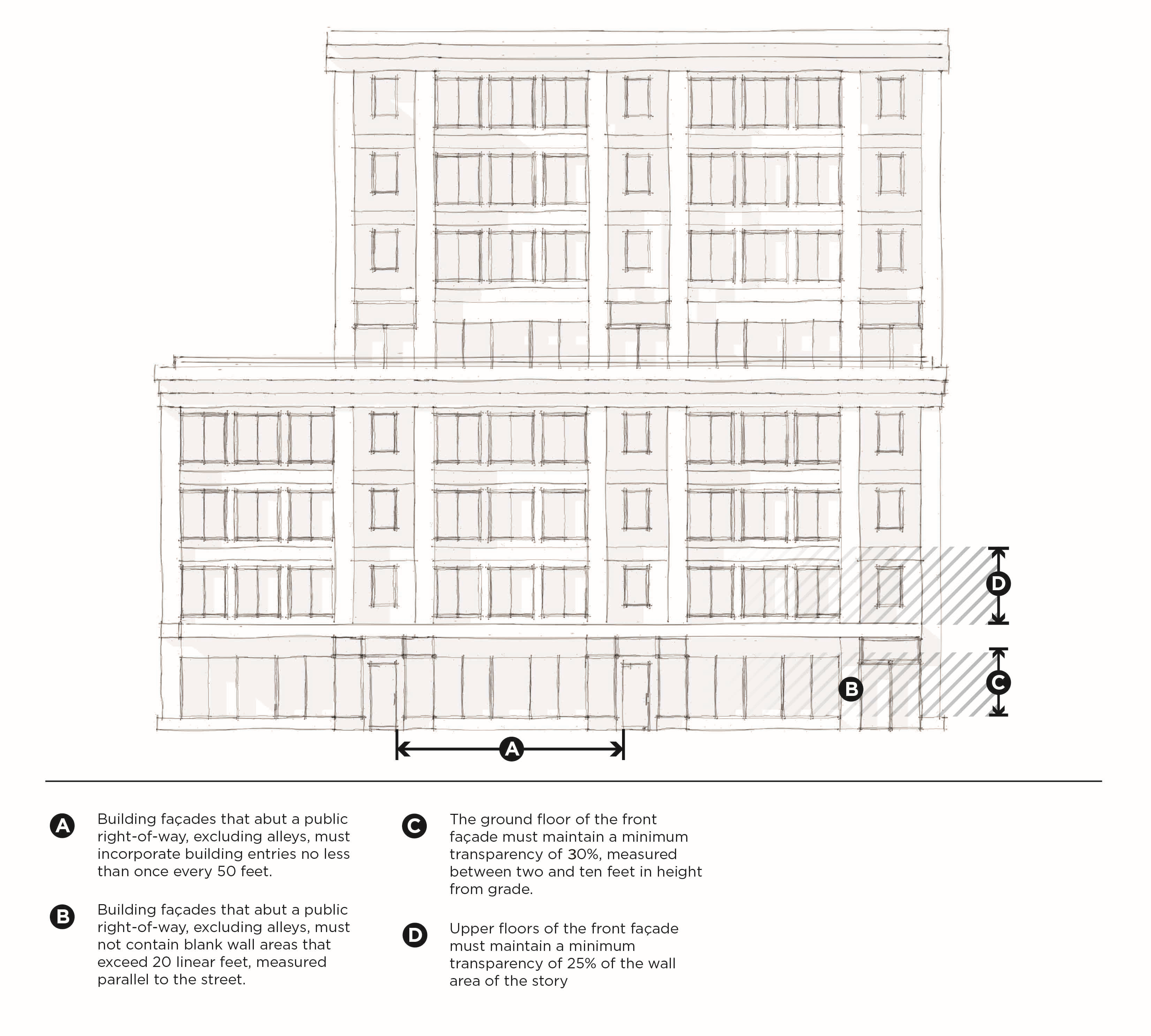 Buildings over 85 feet in height are required to incorporate a stepback a minimum of ten feet from the street-facing façade plane. Such stepback must occur above the third story, and below the seventh story.