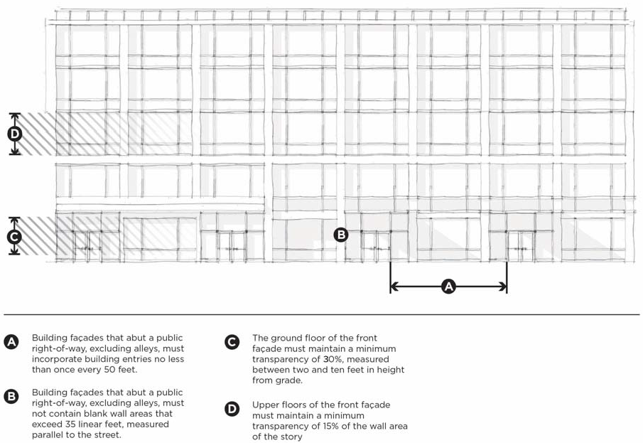 In the C-N, C-G, C-H-2, C-R-2, and O Districts, the following building materials are prohibited on any façade facing a public right-of-way, excluding alleys, or any façade that abuts a residential district. Such materials may still be used as decorative or detail elements for up to 25% of the façade, or as part of the exterior construction that is not used as a surface finish material.