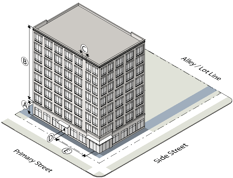 If you are in the Cumberland Avenue District go to Sec. 7.0.3 for general rules that apply to all subdistricts. The Section includes rules for such things as: how to measure building height; what things are allowed to encroach into building setbacks; and how to measure ground floor transparency.
